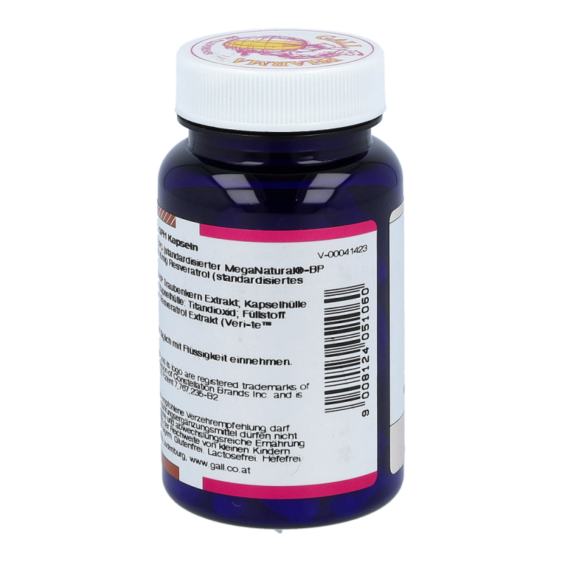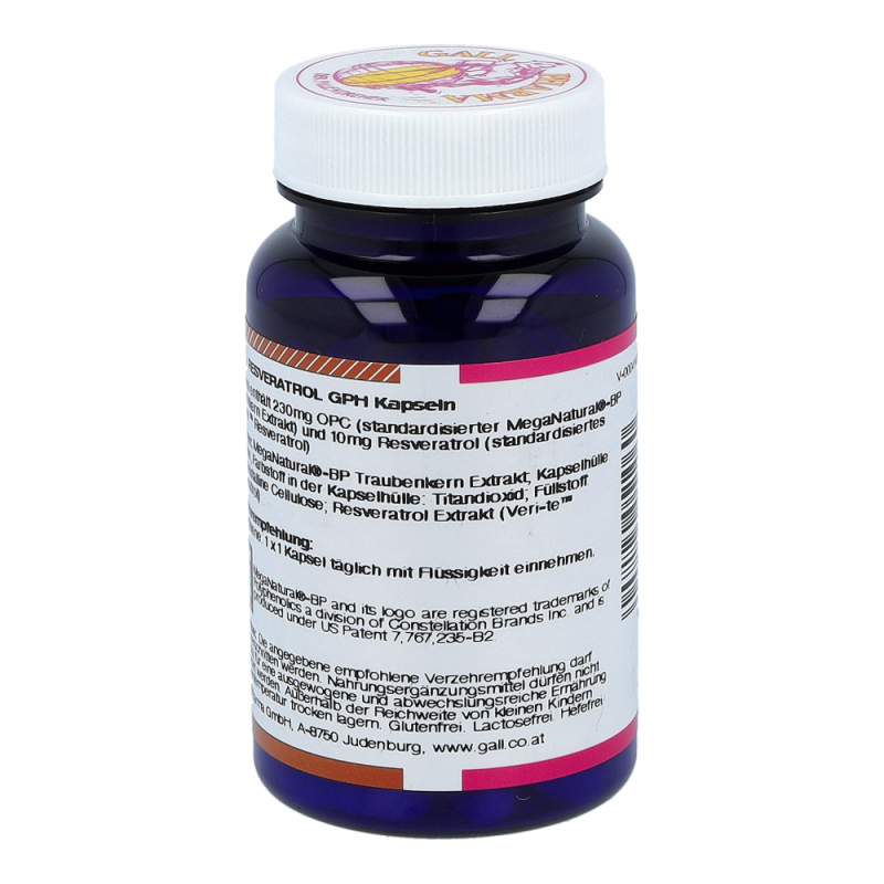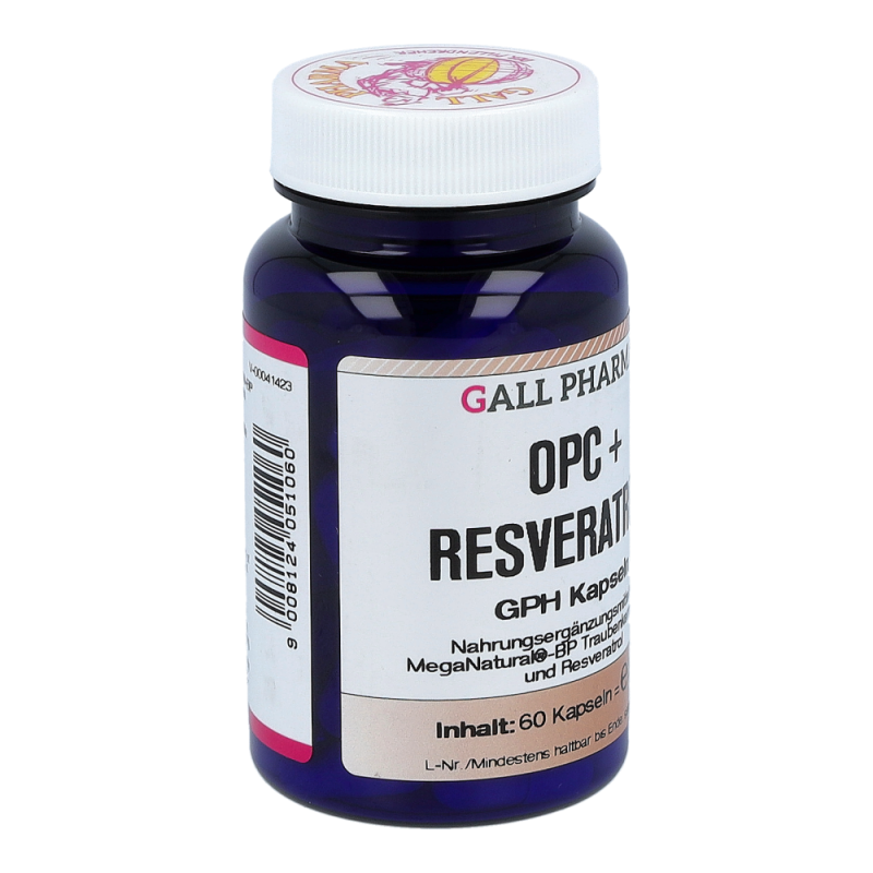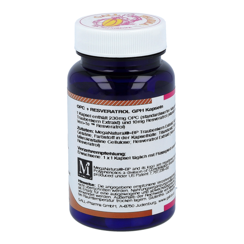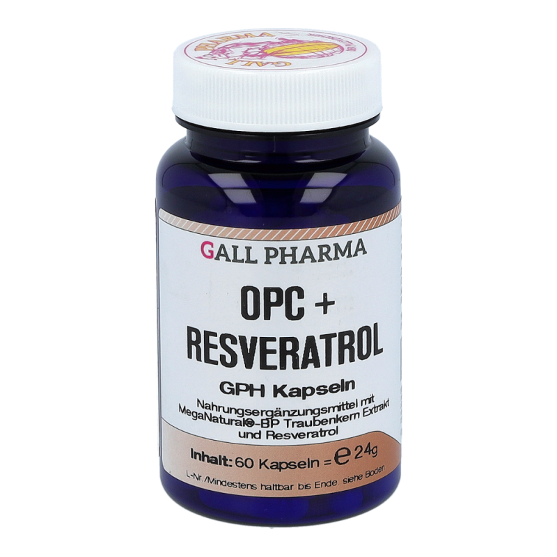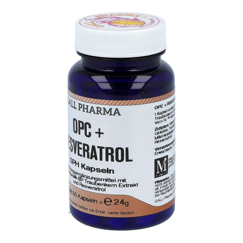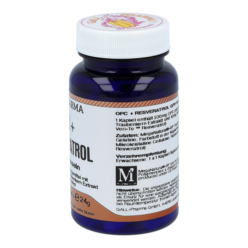 OPC + Resveratrol GPH Kapseln beinhalten mindestens 230 mg OPC und 10 mg Resveratrol in einer Hartgelatinekapsel, die aufgrund der antioxidativen Eigenschaften natürliche Anti-Aging Faktoren sind. Auch werden viele wichtige Bereiche im Körper, wie Gefäße, Immunsystem und Zellschutz positiv beeinflusst. So können Arterienverkalkung und Herzinfarkt vorgebeugt und das Immunsystem gestärkt werden. erhalten Sie dieses Produkt in Packungen zu 30, 60 und 120 Stück.