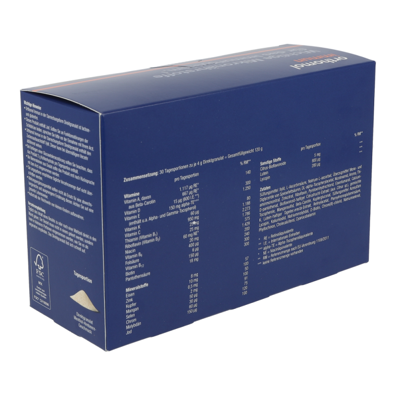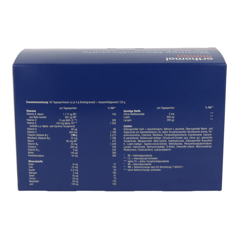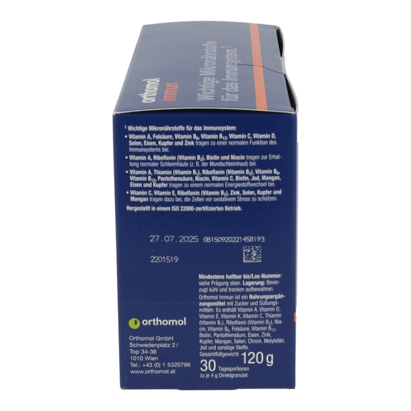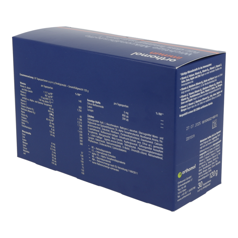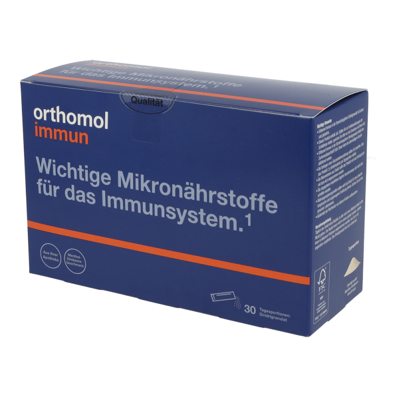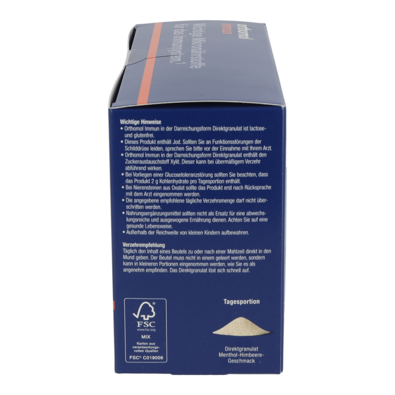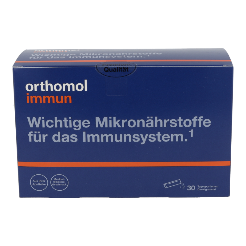 Orthomol Immun® Direktgranulat Menthol-Himbeere 30 Stk. ist ein diätetisches Lebensmittel für besondere medizinische Zwecke (bilanzierte Diät) und eignet sich zur diätetischen Behandlung von nutritiv bedingten Immundefiziten (z.B. bei rezidivierenden Atemwegsinfekten). Orthomol Immun® enthält wichtige Mikronährstoffe für das Immunsystem. Vitamin C, Vitamin D, Zink, Selen, Kupfer, Folsäure, Vitamin A, Vitamin B6 und Vitamin B12 tragen zur normalen Funktion des Immunsystems bei. Immunzellen müssen sich im Fall einer Aktivierung des Immunsystems schnell teilen und entwickeln. Zink hat eine Funktion bei der Zellteilung, Vitamin A hat eine Funktion bei der Zellspezialisierung. Bei Immunreaktionen können freie Radikale entstehen. Die Antioxidanzien Vitamin C, Vitamin E, Vitamin B2 sowie Zink, Selen, Kupfer und Mangan tragen zum Schutz der Zellen vor oxidativem Stress bei. Auch sekundäre Pflanzenstoffe, wie z.B. Carotinoide und Citrus-Bioflavonoide, haben antioxidative Eigenschaften. Die Mukosa (Schleimhaut) des Atemtraktes spielt eine wichtige Rolle als Barriere gegen Keime aller Art. Vitamin A, Vitamin B2, Biotin und Niacin tragen zum Erhalt der normalen Schleimhäute bei