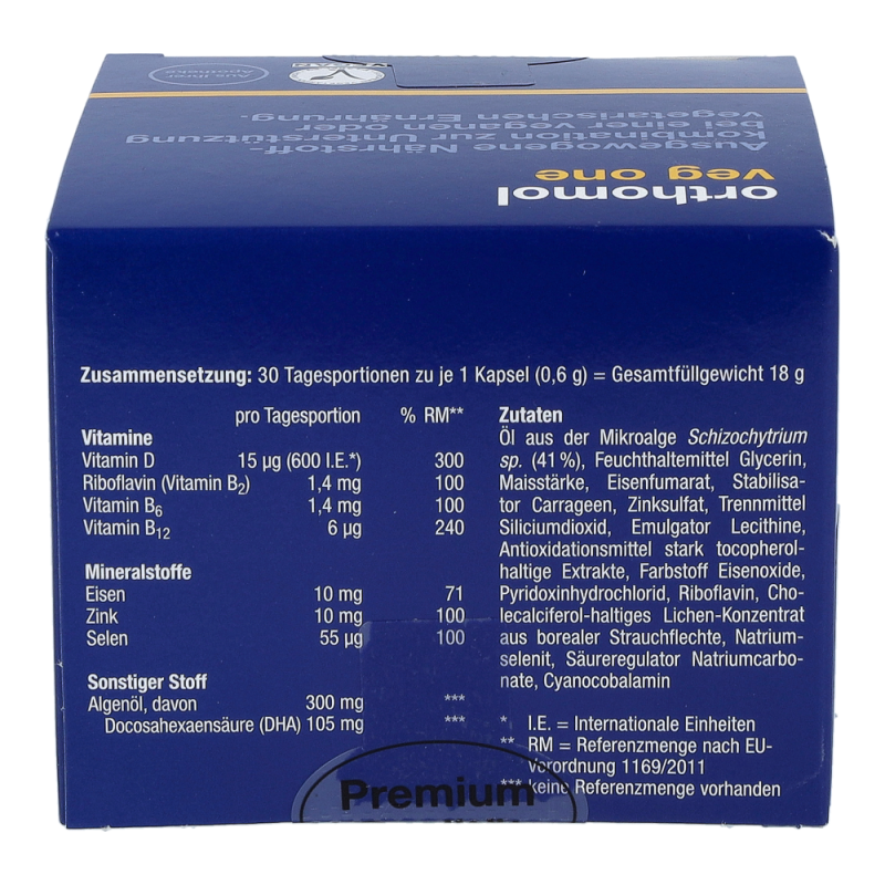 Orthomol Veg one® Kapseln 30 Stk. ist ein Nahrungsergänzungsmittel zur Unterstützung bei einer veganen oder vegetarischen Ernährung. Vitamin B6 und Vitamin B12 tragen zu einem normalen Homocystein-Stoffwechsel sowie gemeinsam mit Vitamin D zu einer normalen Funktion des Immunsystems bei. Vitamin B2 (Riboflavin), Vitamin B6, Vitamin B12 und Eisen tragen zur Verringerung von Müdigkeit und Ermüdung bei. Zink trägt zu einem normalen Kohlenhydrat-Stoffwechsel, Fettsäurestoffwechsel und zu einer normalen Eiweißsynthese sowie zur Erhaltung normaler Haut bei. Selen und Zink tragen zur Erhaltung normaler Haare und Nägel bei.