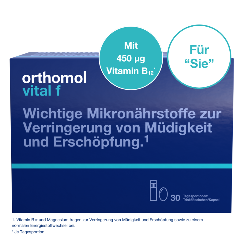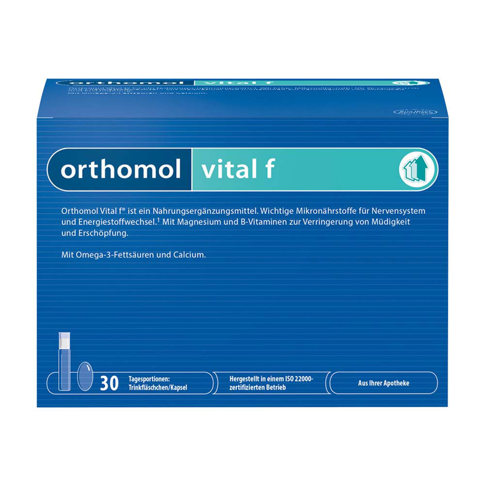 Orthomol Vital f® Trinkfläschchen und Kapseln 30 Stk. ist ein Nahrungsergänzungsmittel mit wichtigen Mikronährstoffen für Nervensystem und Energiestoffwechsel. Müdigkeit und Erschöpfung werden verringert. Die Nahrungsergänzung trägt zu einem normalen Energiestoffwechsel sowie einer normalen Funktion des Nervensystems bei. Die Omega-3-Fettsäuren EPA und DHA tragen zu einer normalen Herzfunktion bei. Die positive Wirkung stellt sich bei einer täglichen Aufnahme von 250 mg EPA und DHA ein. Calcium wird zum Erhalt normaler Knochen und Zähne benötigt.