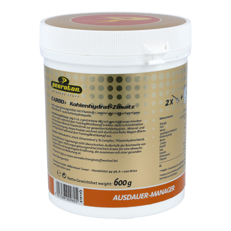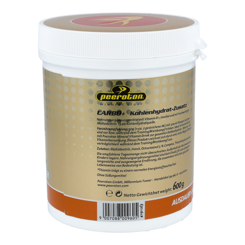 Der Peeroton Kohlenhydrat-Zusatz ist besonders leicht verdaulich und dient zur Auffüllung der Kohlenhydrat- bzw. Glykogendepots. So schafft er die optimale Voraussetzung zur Bewältigung körperlicher Belastungen und erhöht das Durchhaltevermögen. Mit einem glykämischen Index von 35 kann er als optimales Kohlenhydratpräparat für den Ausdauersport betrachtet werden, das schonend und rasch aufgenommen wird.