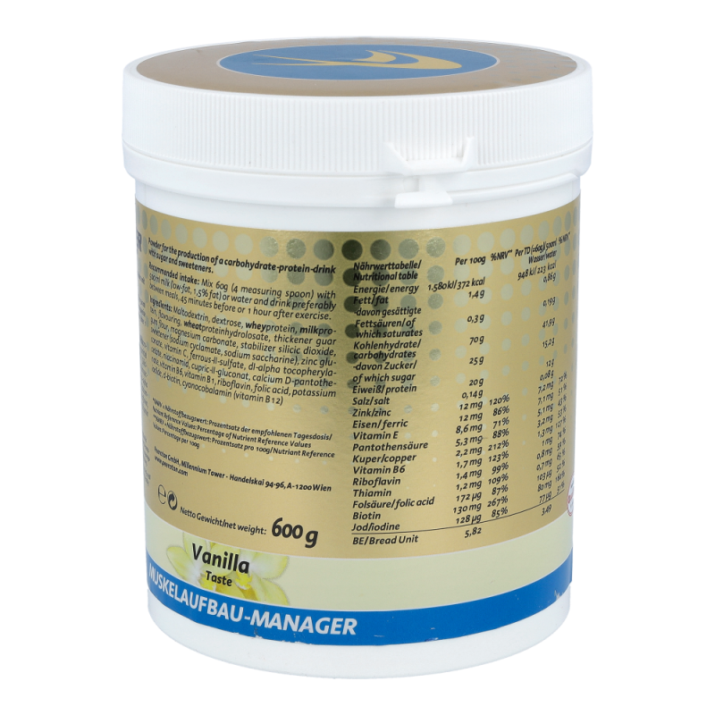 Maltodextrin (enthält SO2), Dextrose, Molkeprotein (enthält Emulgator Soja-Lecithin), Milchprotein, naturidentische Aromen, Weizenproteinhydrolysat, Verdickungsmittel Guarkernmehl, Magnesiumcarbonat, Stabilisator Kieselerde, Zinkgluconat, Süßstoff (Natrium Cyclamat, Natriumsaccharin), Vitamin C, Eisen-II-Sulfat, dl-alpha Tocopherylacetat, Niacin, Kupfer-II-gluconat, Pantothensäure, Vitamin B6, Vitamin B1, Vitamin B2, Folsäure, Kaliumjodid, Biotin, Vitamin B12, Lactose