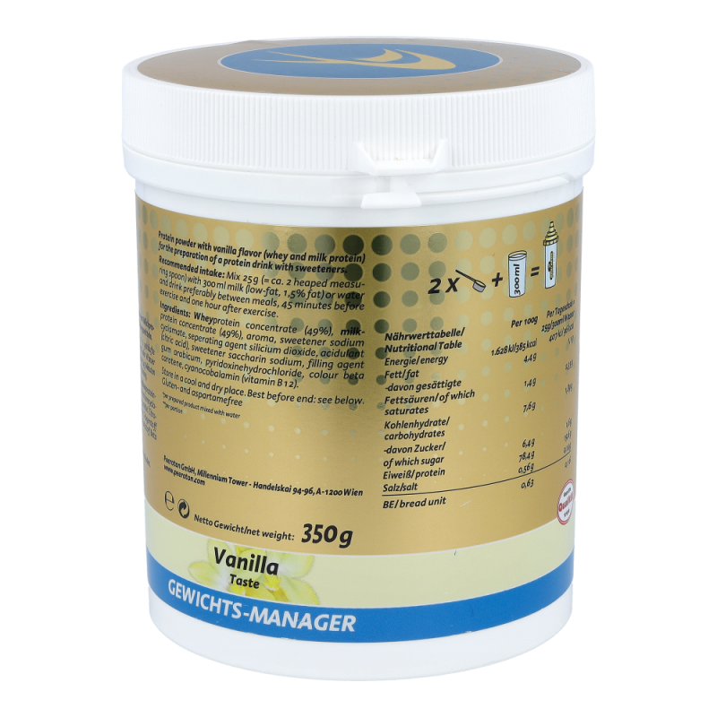 Molkeprotein 49%, Milchprotein 49%, Aroma, Süßungsmittel (Natriumcyclamat, Natriumsaccharin), Stabilisator Kieselsäure, Säuerungsmittel Zitronensäure, Maltodextrin, Trägerstoff Gummi arabicum, Saccharose, Vitamin B6, Farbstoff (Beta Carotin), Vitamin B12, Lactose
