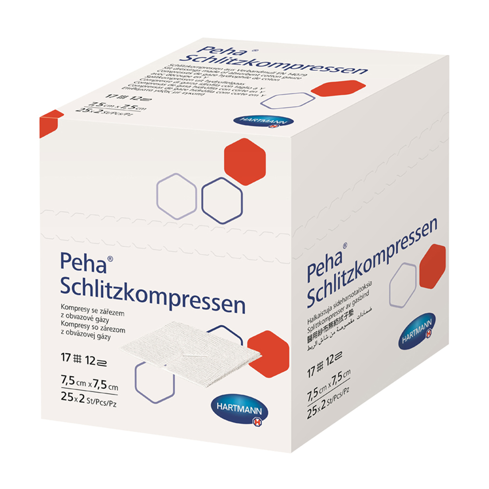 Peha Schlitzkompresse aus Verbandmull, EN 14079, steril, 17fädig, 12fach, mit Y-Schnitt gute Saugfähigkeit, luftdurchlässig, weich und geschmeidig.