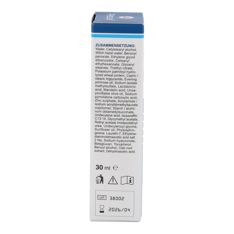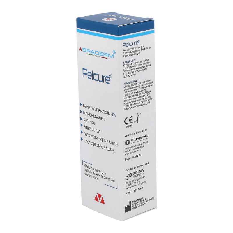 PelCure Creme – bei leichter und mittelschwerer Akne und zur vorbeugenden Behandlung. Pelcure ist eine Creme für zu Akne neigende Haut. Sie wirkt sebumregulierend und reduziert nachweislich Unreinheiten und Komedonen. Verschiedene Inhaltsstoffe sorgen auf unterschiedlichen Wegen für ein ebenmäßiges Hautbild. Durch diese aufeinander abgestimmten Eigenschaften wird der natürliche Heilungsprozess der Haut unterstützt und neuen Entzündungen und Unreinheiten vorgebeugt..Retinol öffnet verstopfte Poren und befreit diese von überschüssigem Talg. Der Entstehung neuer Unreinheiten und Mitesser wird so vorgebeugt. Lactobionicsäure bildet einen atmungsaktiven Schutzfilm, welcher die Hautbarriere stärkt, Feuchtigkeit spendet und die Haut so vor schädlichen Umwelteinflüssen schützt. Benzoylperoxid, Mandelsäure und Zink sind antibakteriell wirkende und entzündungshemmende Inhaltsstoffe. Sie ermöglichen es der Haut, wieder ins Gleichgewicht zu kommen, und beugen neuen Entzündungen vor.