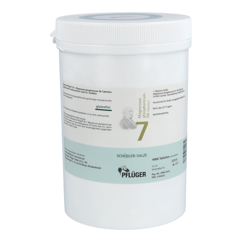 Pflüger Dr. Schüßler Nr. 7 Magnesium Phosphoricum steuert das vegetative Nervensystem. Es ist zuständig für die unwillkürliche Muskeltätigkeit und somit für den Ausgleich von Antrieb und Entspannung. Magnesium phosphoricum spielt eine wichtige Rolle in Bezug auf die Darmtätigkeit und das Nervensystem.