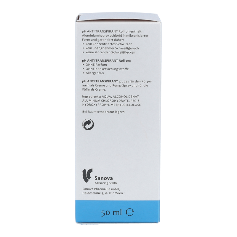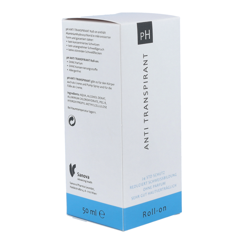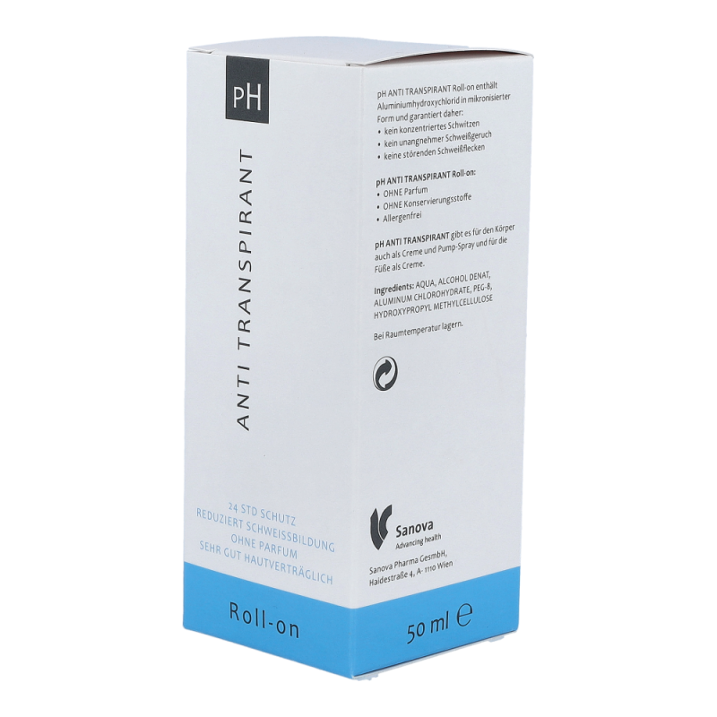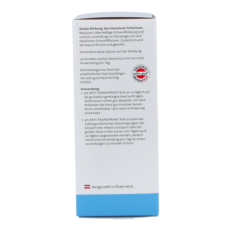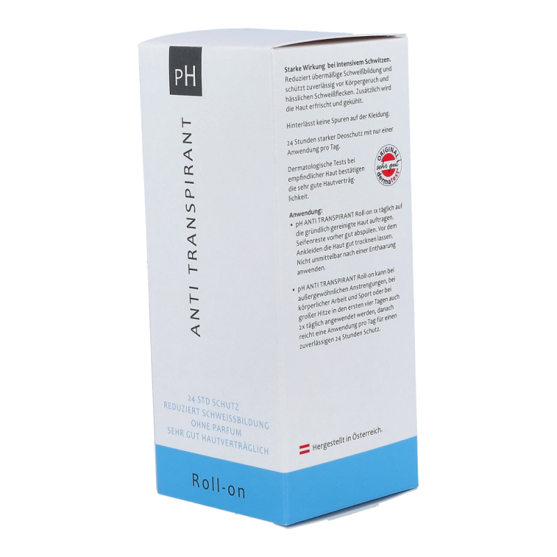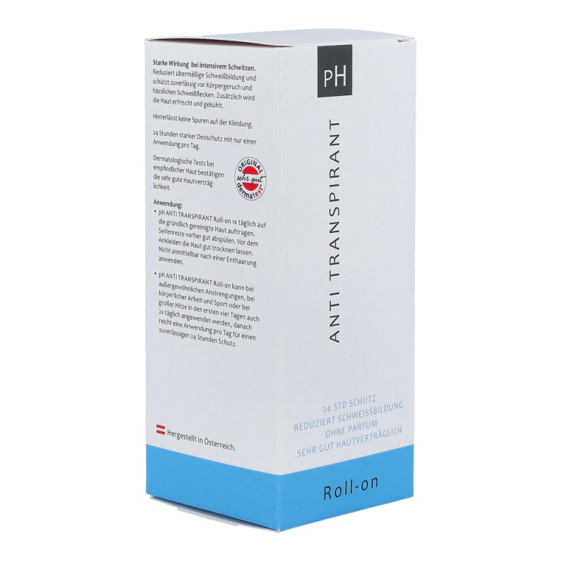 ph-Antitranspirant Roll-On reduziert übermäßige Schweißbildung und schützt zuverlässig vor Körpergeruch und hässlichen Schweißflecken. Er hinterlässt keine Spuren auf der Kleidung. 24 Stunden starker Deoschutz mit nur einer Anwendung pro Tag.