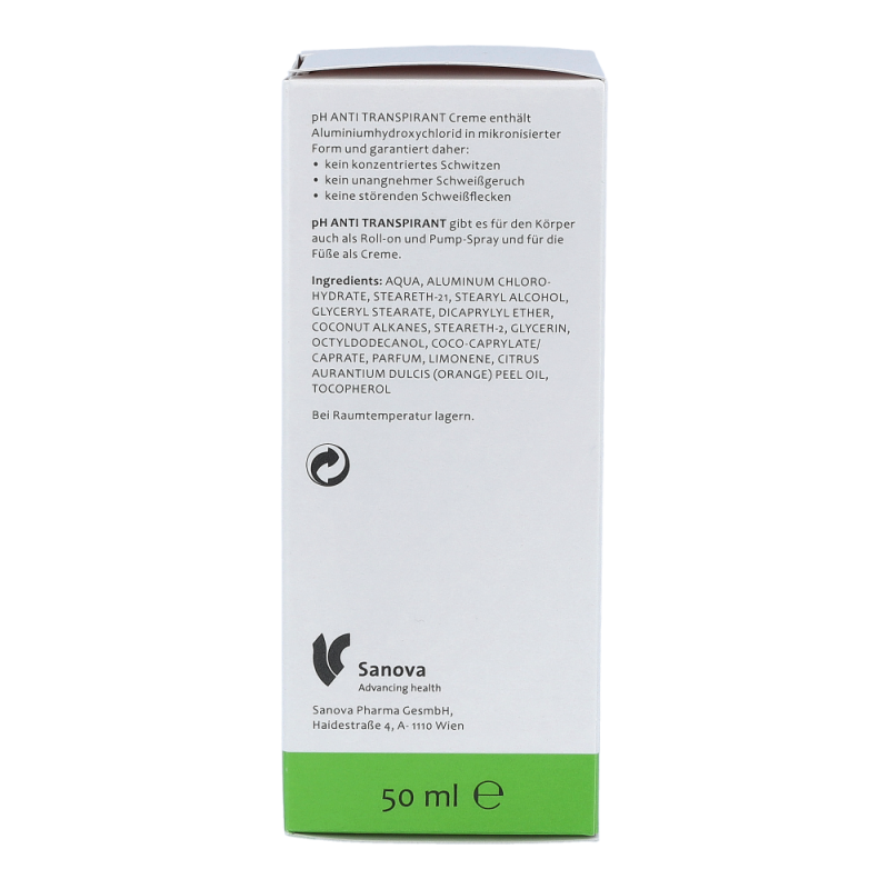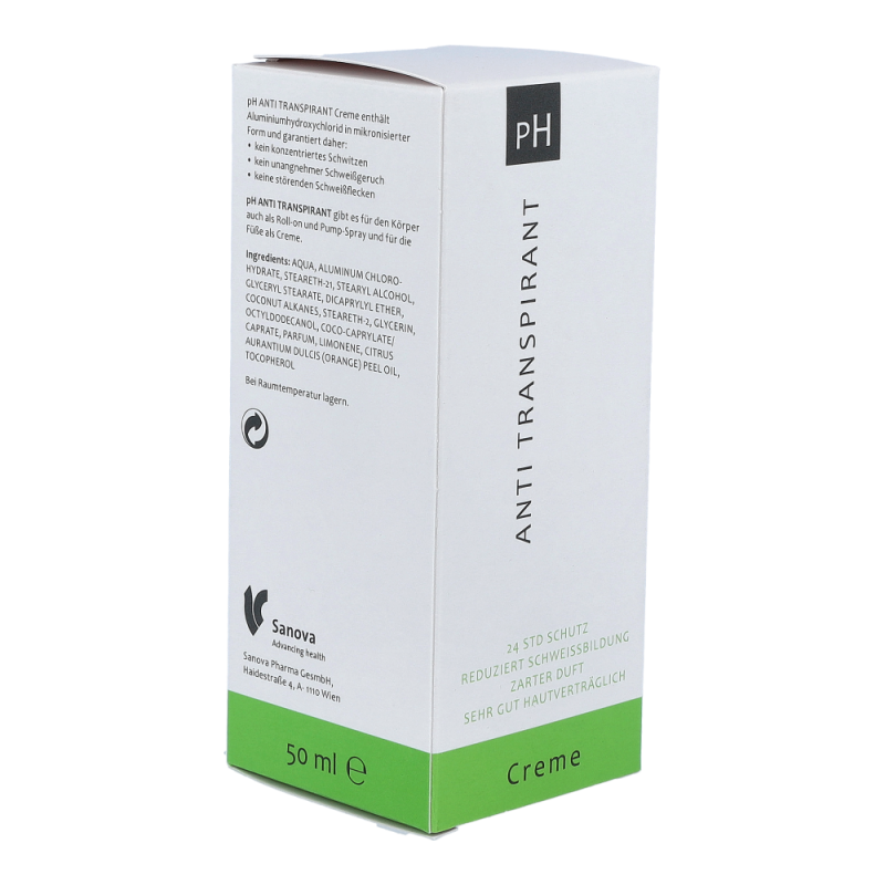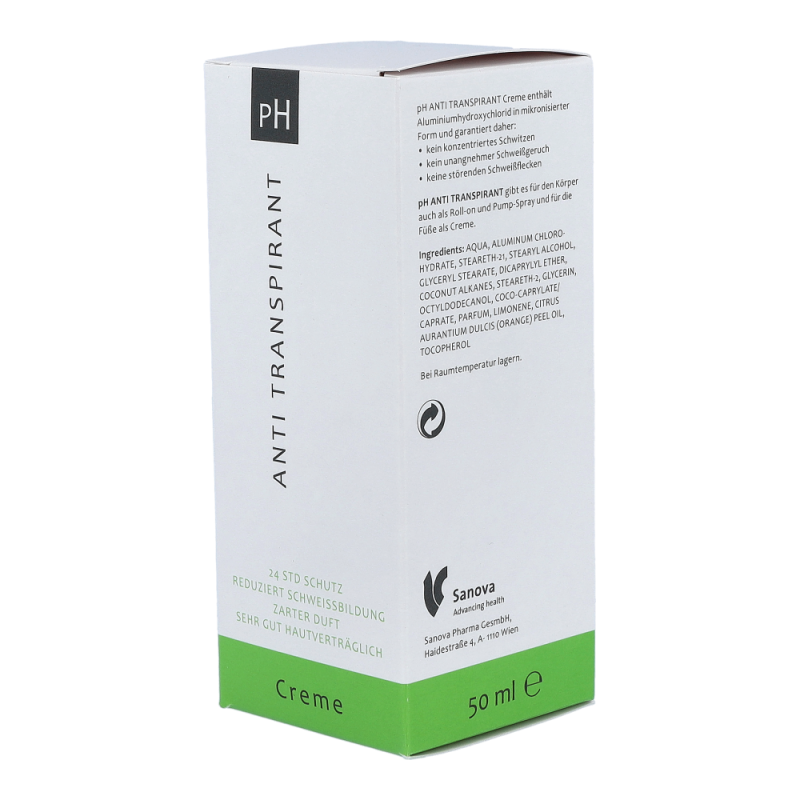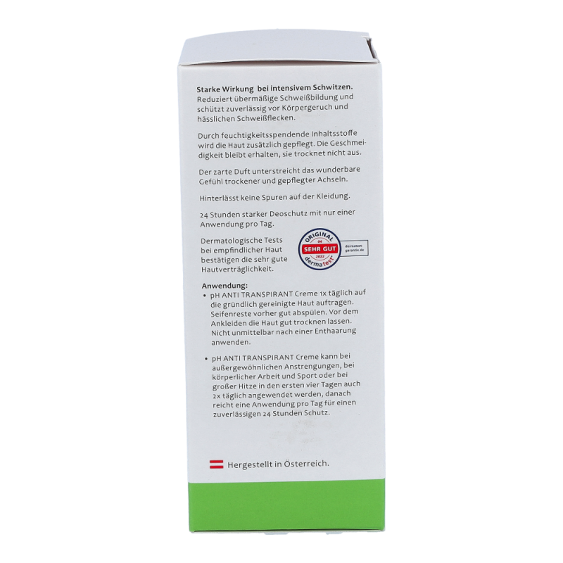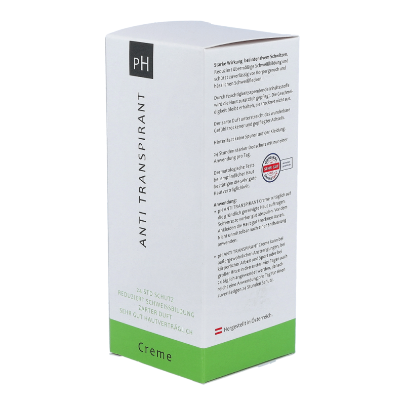pH ANTI TRANSPIRANT Creme bietet 24 Stunden starken Deoschutz mit nur einer Anwendung pro Tag. Selbst kleine Mengen von pH ANTI TRANSPIRANT Creme reichen aus, um das Schwitzen deutlich einzudämmen.
