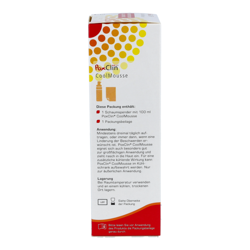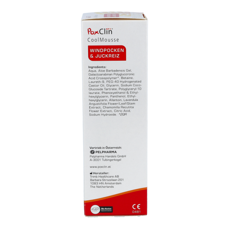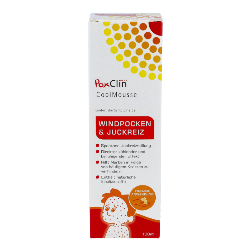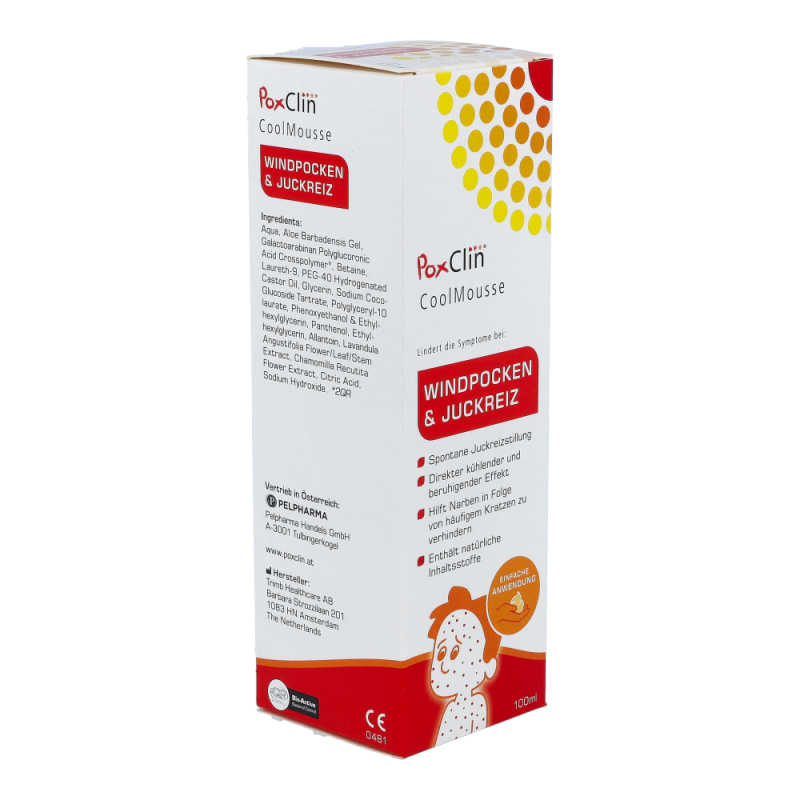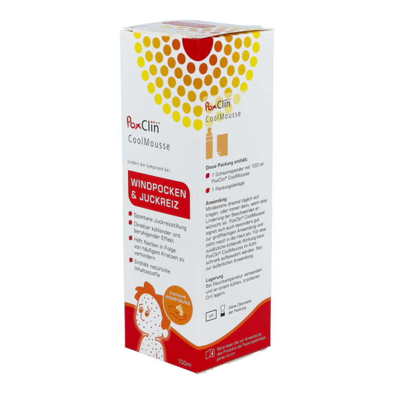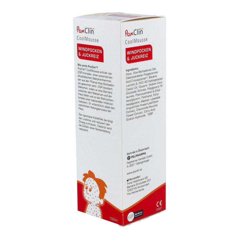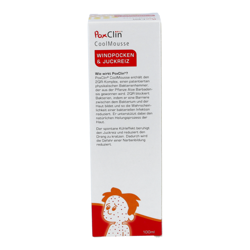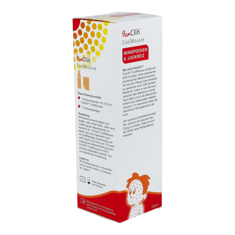 PoxClin enthält 2QR, einen bioaktiven Bakterienhemmer. Dieser mindert das Risiko einer bakteriellen Entzündung, indem er schädliche Bakterien abblockt.Es handelt sich dabei um ein Polysaccharid, das von der Pflanze Aloe barbadensis stammt. 2QR blockiert Bakterien, indem er eine Barriere zwischen dem Bakterium und der Haut bildet. Die Bakterien können das Gewebe nicht mehr befallen.Das Risiko für Entzündungen verringert sich und der natürliche Heilungsprozess der Haut wird gefördert. Verhinderung der NarbenbildungDie Wirksamkeit kann dabei durch wiederholtes Auftragen des Schaums positiv beeinflusst werden. Der Schaum lindert den Juckreiz und schützt die Haut. Dadurch kratzt sich Ihr Kind seltener, und bakterielle Entzündungen treten weniger häufig auf. Den Schaum vor jedem Kleidungswechsel des Kindes und immer dann auftragen, wenn eine Linderung nötig ist.Der Schaumspender von PoxClin enthält 100 ml eines kühlenden Schaums mit natürlichen Inhaltsstoffen. Dank eines Lavendel- und Kamilleextrakts riecht PoxClin CoolMousse leicht und angenehm.