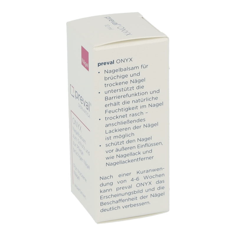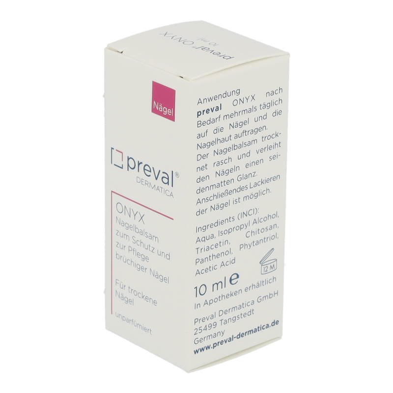 preval ONYX ist ein Nagelbalsam für brüchige und trockene Nägel.Das in preval ONYX enthaltene Chitosan verbindet sich mit dem Keratin der Nagelplatte und bildet so eine Schutzschicht gegen äußere Einflüsse, wie z.B. gegen Nagellack und der besonders austrocknenden Wirkung von Lackentfernern. Panthenol und Phytantriol erhöhen den Feuchtigkeitsgehalt im Nagel und sorgen somit für mehr Elastizität. Nach 4-6 Wochen Anwendung von preval ONYX sind die Nägel wieder elastisch, glänzend und widerstandsfähig.