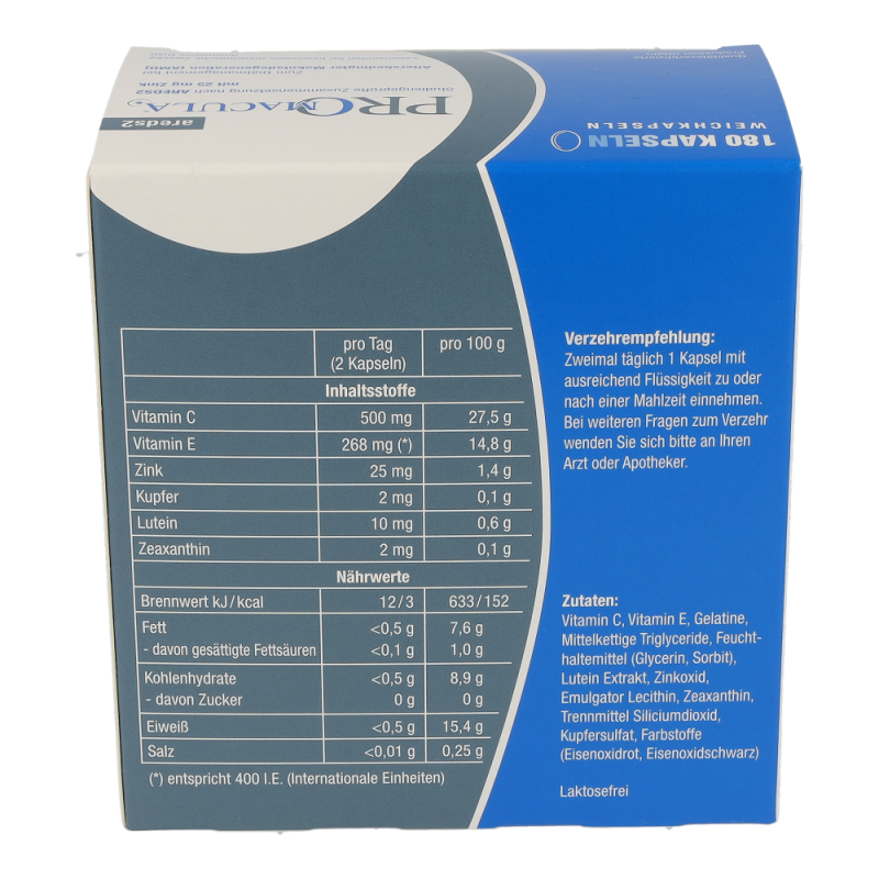 Ascorbinsäure, natürliches Vitamin E, Gelatine, pflanzliches Öl, Glycerol, Lutein Extrakt, Zinkoxid, Lecithin, Zeaxanthin, Farbstoffe (Titaniumdioxid, Eisenoxid, Brilliantblau FCF), Trennmittel Siliciumdioxid, Kupfersulfat