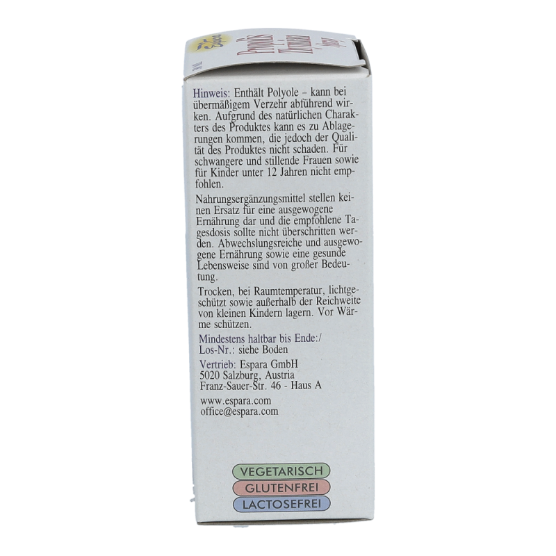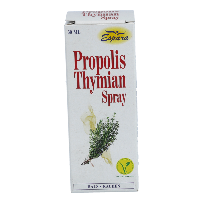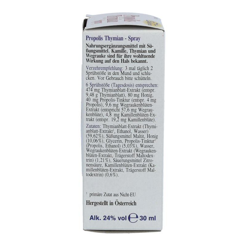 Nahrungsergänzungsmittel mit Süßungsmittel. Kamille, Thymian und Wegrauke sind für ihre wohltuende Wirkung auf den Hals bekannt. Enthält Polyole – kann bei übermäßigem Verzehr abführend wirken. Aufgrund des Gehaltes an Alkohol wird der Propolis-Thymian Spray für schwangere und stillende Frauen sowie für Kinder unter 12 Jahren nicht empfohlen.