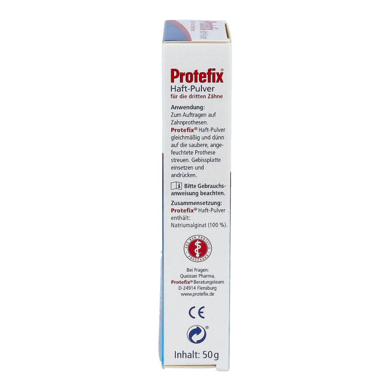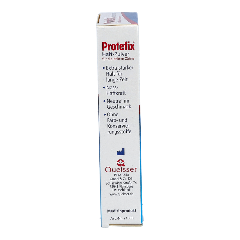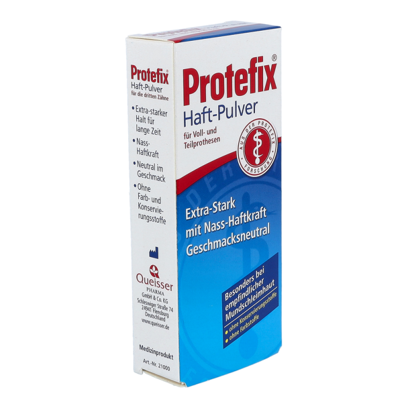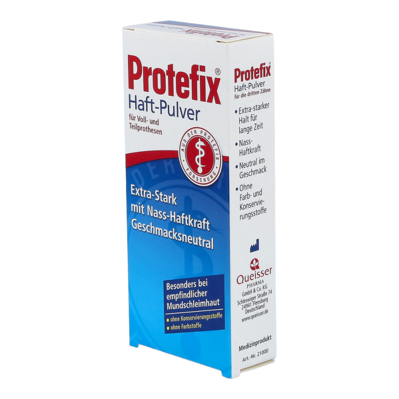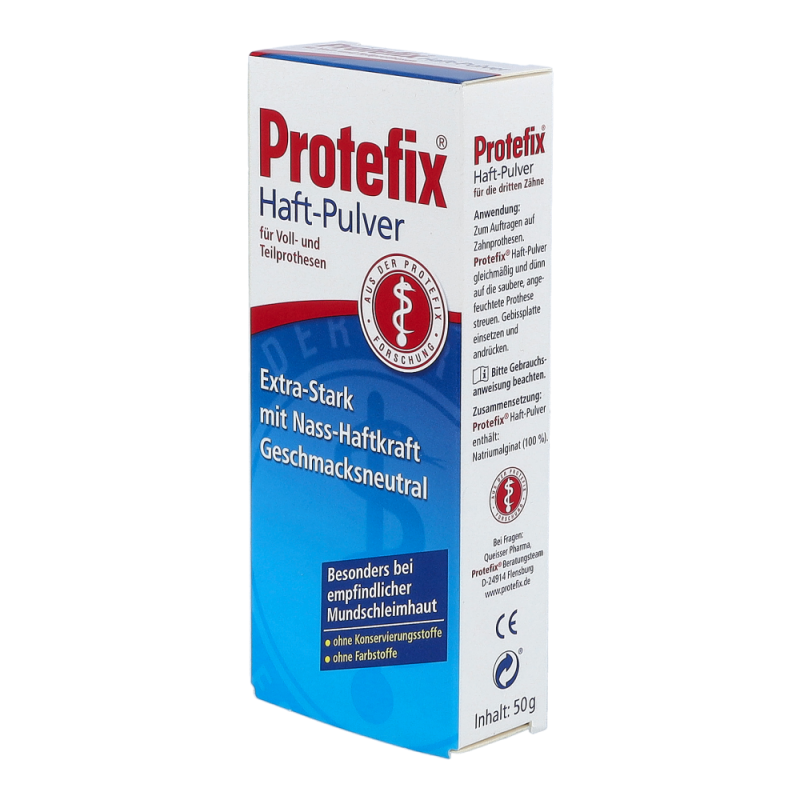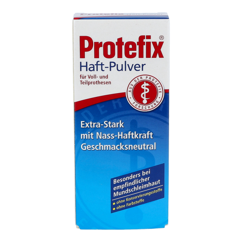 Das bewährte Haftmittel ist ideal bei leichteren Haftproblemen und dünnflüssigem Speichel. Protefix Haft-Pulver wird auf die feuchte Prothese gestreut und entwickelt sofort nach dem Einsetzen eine sichere, lang anhaltende Haftleistung. Das geruchs- und geschmacksneutrale Protefix Haft-Pulver aus natürlichem Natriumalginat ist besonders für die empfindliche Mundschleimhaut sehr gut geeignet.