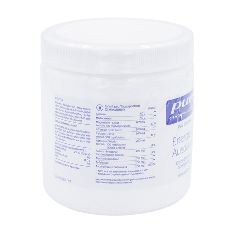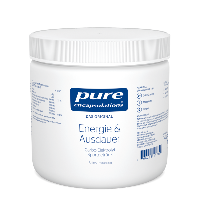 Pure Encapsulations® Energie & Ausdauer enthält komplexeKohlenhydrate zur Aufrechterhaltung der Ausdauerleistung undElektrolyte, um Verluste durch vermehrtes Schwitzen auszugleichen.Durch den Mineralstoff Magnesium wird eine normale Muskelfunktionunterstützt. Maltodextrinsowie Glucose sind gute Energiequellenund sorgen für einen ausgeglichenen Blutzuckerspiegel.Vitamin C trägt zu einer normalen Funktion des Immunsystems beiund dient als Beitrag zum Schutz der Zellen vor oxidativem Stress.