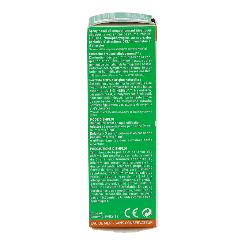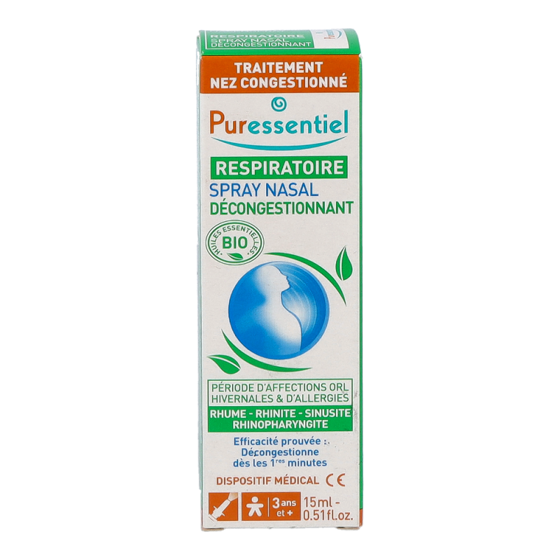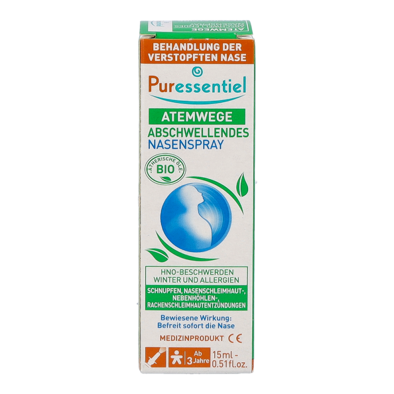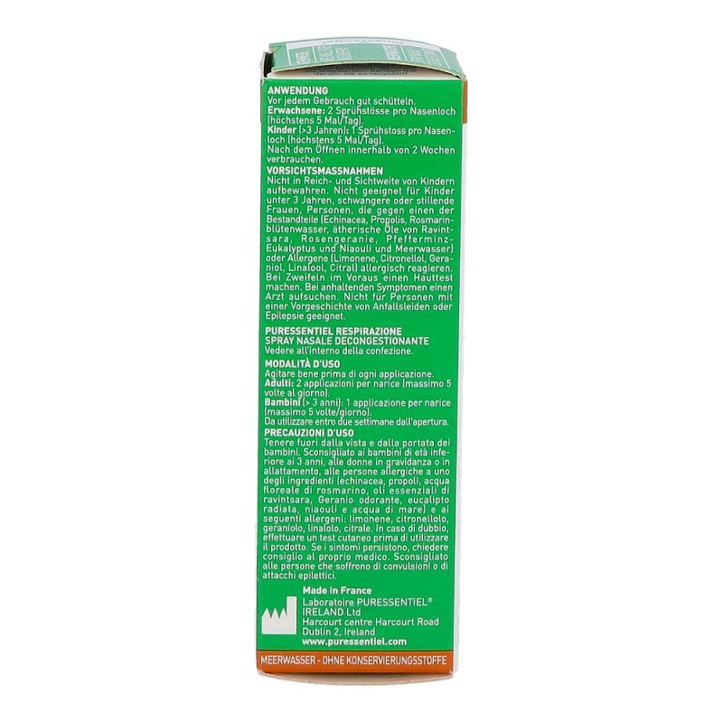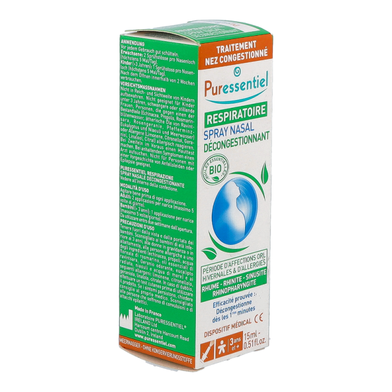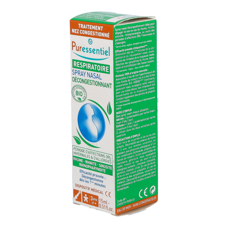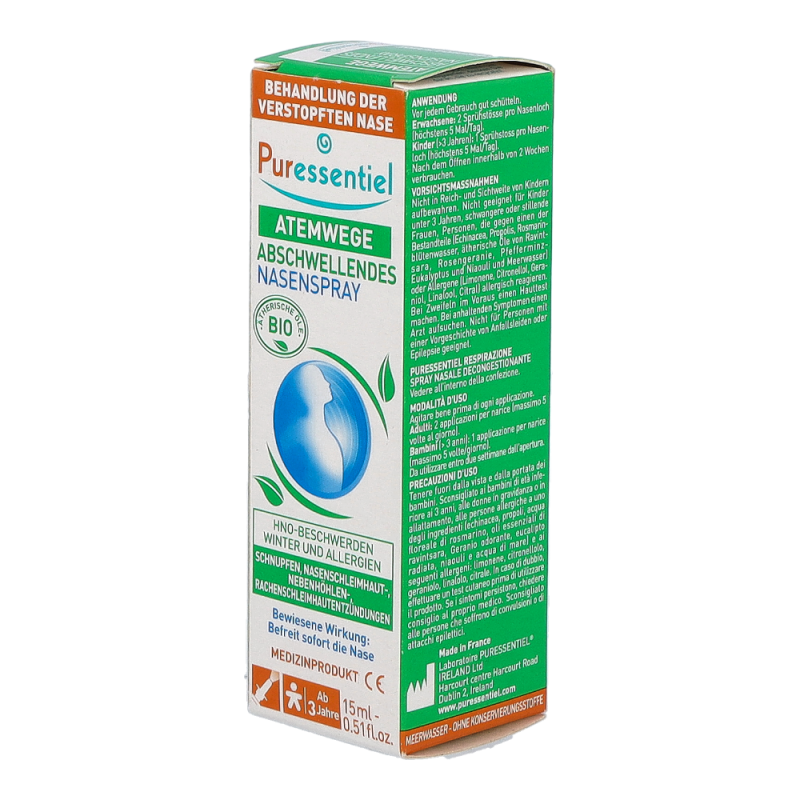 Puressentiel Atemwege Nasenspray hilft die Nase zu reinigen, zu befeuchten und zu befreien. Seine Lösung auf Basis von Meerwasser und Bio-Rosmarinblätenwasser ist angereichert mit ätherischen Ölen mit abschwellenden, tonisierenden und antiinfektiösen Eigenschaften, die sehr wohltuend bei Erkältungen, verstopfter Nase und Reizungen der Atemwege oder der Gehörgänge sind.