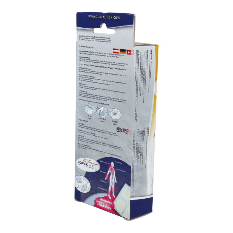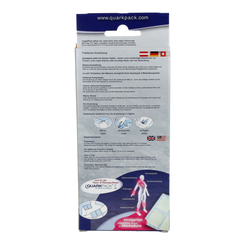 Je nach Temperatur des Wassers ermöglicht QUARKPACK 3 Behandlungsarten: Kühlende Kompresse: Bei Verwendung von kaltem Wasser nimmt das Topfenpulver Kälte an – durch das Auflegen entsteht auf der behandelten Brust eine angenehme, kühlende Wirkung. Intensiv kühlende Kompresse: Die anwendungsfertige, feuchte Kompresse wird vor dem Auflegen auf die zu behandelnde Brust noch ca. 20 Minuten in den Kühlschrank gegeben. Der Wickel wird so extra-kalt und besonders schmerzlindernd. Warmer Wickel: Durch Verwendung von warmem ( nicht heissem) Wasser bei der Zubereitung der Kompresse nimmt das Topfenpulver Wärme an. Zur Vorbeugung ist dies ideal. Die Anwendung: Die Kompresse mindestens 30 Minuten, mit dem Fortsatz unter der Achsel, auf die Brust legen. Eventuell mit einem Handtuch fixieren. Danach die Kompresse entfernen und gegebenenfalls noch vorhandene Feuchtigkeit auf der Haut mit einem trockenen Tuch abwischen. Idealerweise wiederholt man die Anwendung 3 x täglich.