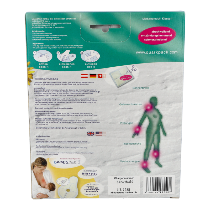 Quarkpack Topfenwickel Arnika ist eine leicht und sauber anzuwendende Alternative zum klassischen Topfenwickel. Durch die einfache Handhabung bleiben keine klebrigen Reste zurück und zusätzliche Arnika wirkt entzündungshemmend.