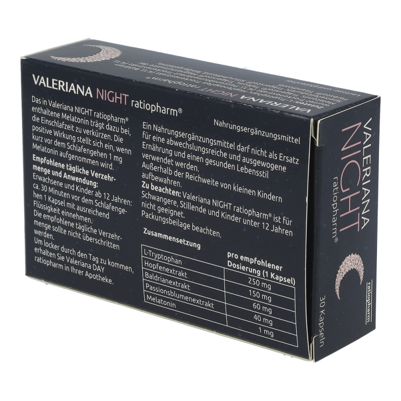 Valeriana NIGHT ratiopharm ist ein Nahrungsergänzungsmittel mit Baldrian, Hopfen und Passionsblume, welches die körpereigene Substanz Melatonin enthält. Diese steuert den Tag Nacht-Rhythmus unseres Körpers und unsere spezielle Melatonin Einschlafformel trägt zusätzlich zu einem entspannten und erholsamen Schlaf bei. Auch leichte Stresssymptome werden reduziert und die Einschlafzeit wird verkürzt.
