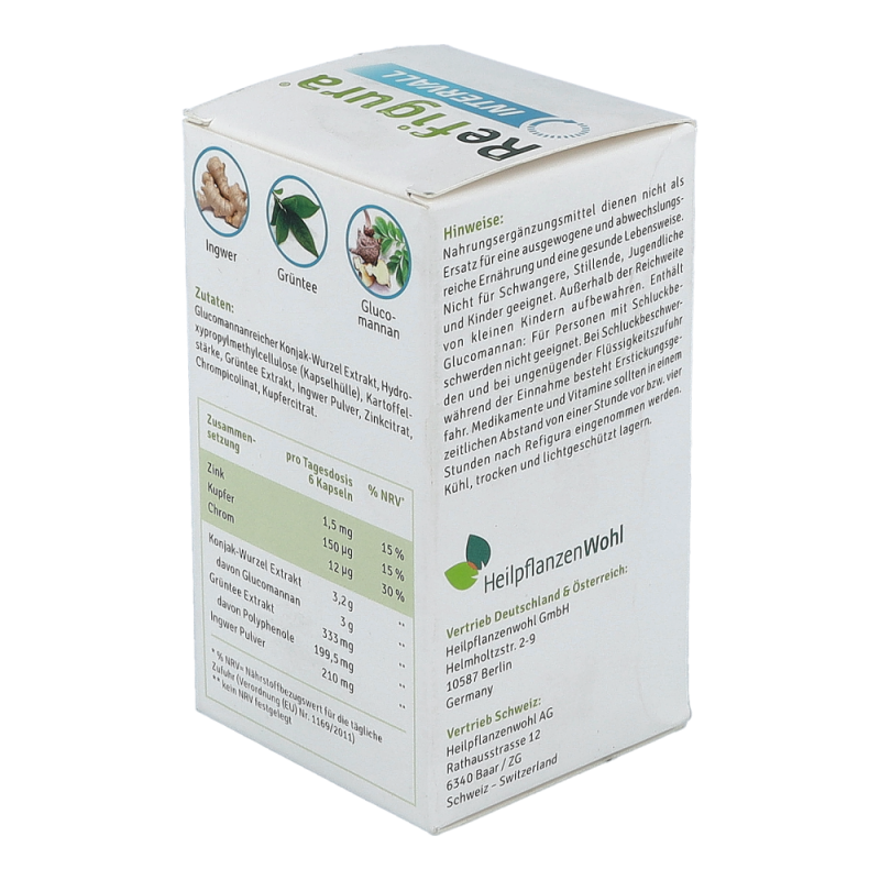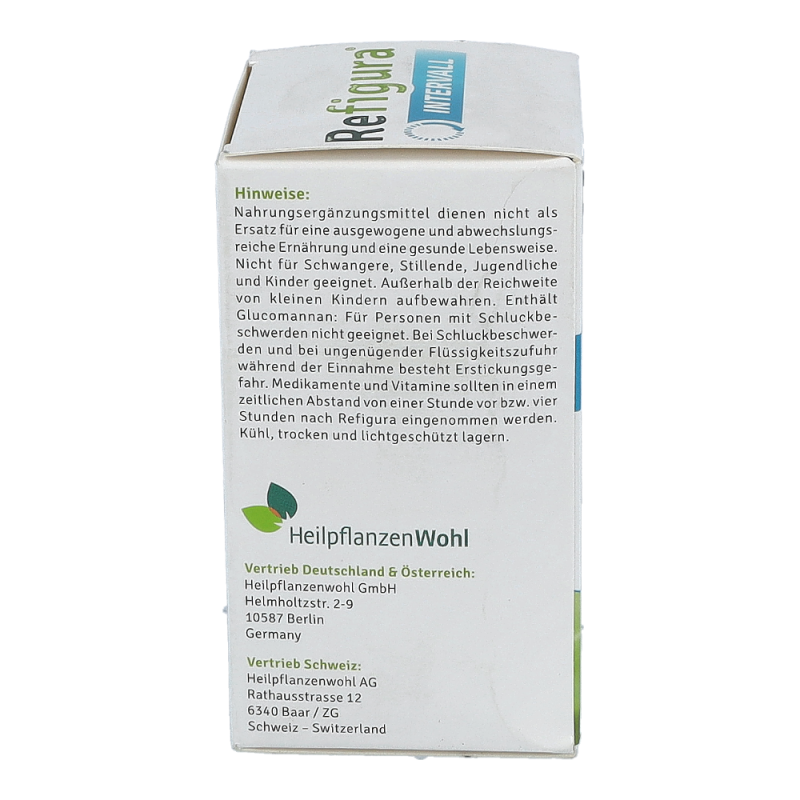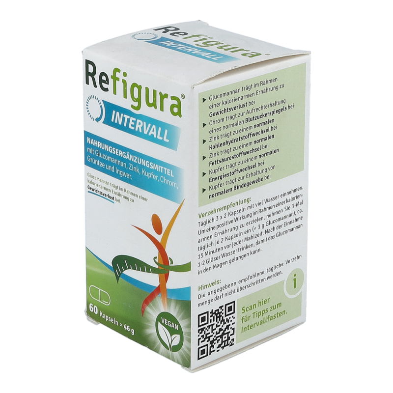 Refigura Intervall Nahrungsergänzungsmittel mit Glucomannan, Zink, Kupfer, Chrom, Grüntee und Ingwer.