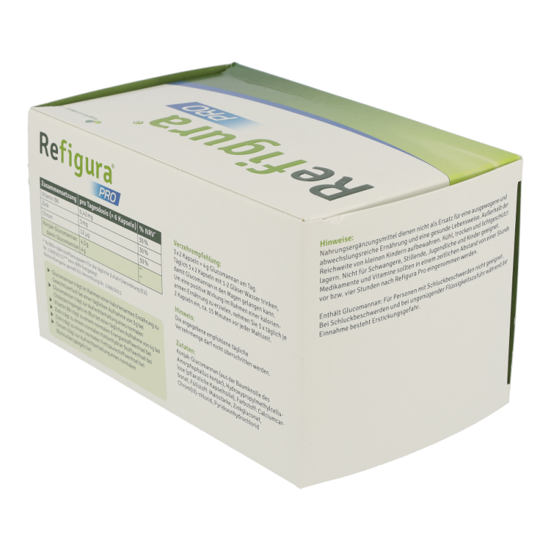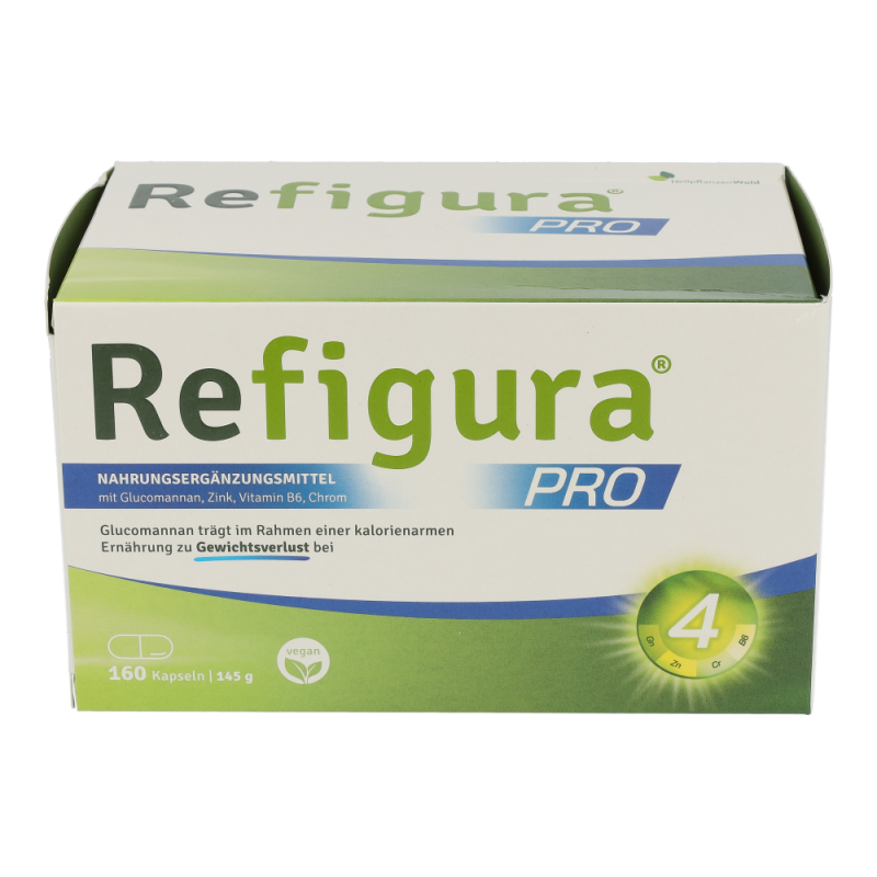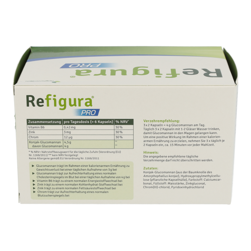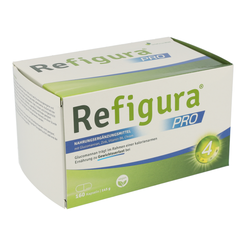 Refigura Pro ist ein Nahrungsergänzungsmittel mit Glucomannan, Vitamin B6, Zink und Chrom
