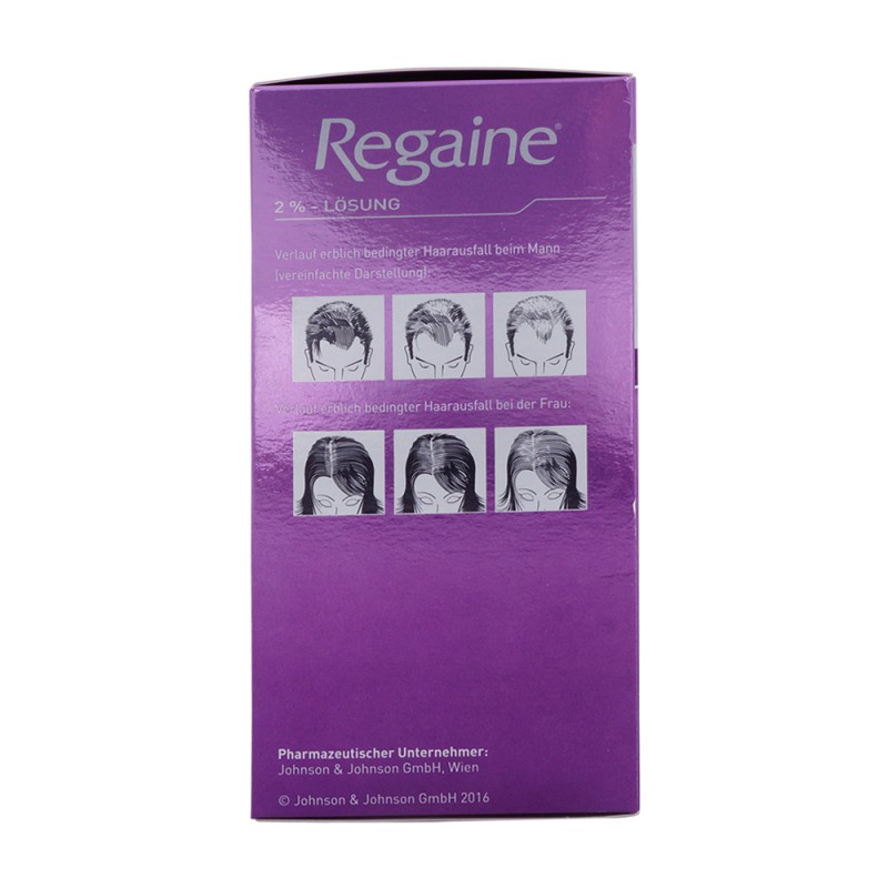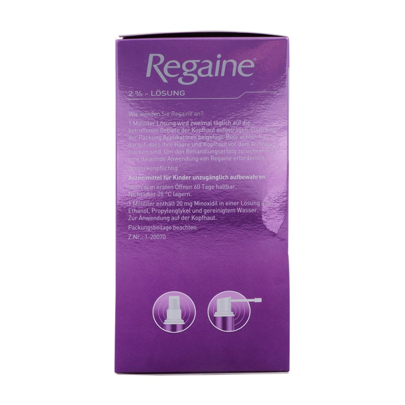 Regaine® dient als Haarwuchsmittel bei erblich bedingtem Haarverlust. Es regt das Wachstum neuer Haare an und wirkt auf diese Weise gegen Haarausfall. Diese Lösung erhalten Sie in den Packungsgrößen 60 ml und 180 ml.