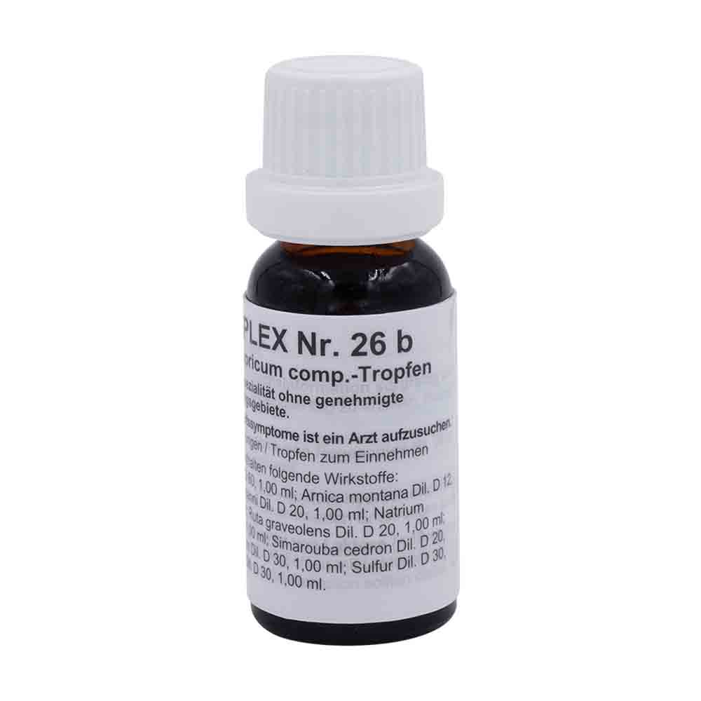 Regenaplex Nr. 26B wirkt gegen Arteriosklerose, Unterschenkelgeschwüre, Abszessen, sowie Nebenhöhlen-Affektionen. Die quasi nach einem Baukastensystem zusammengestellten Regenaplexe sind homöopathische Komplexmittel mit jeweiligen Nummernbezeichnungen.