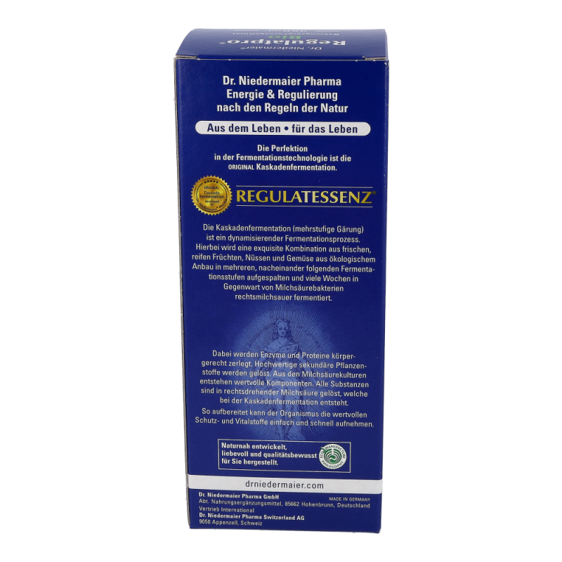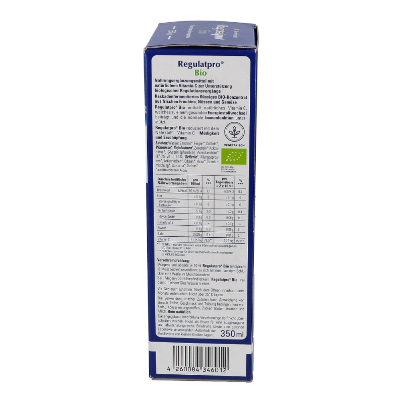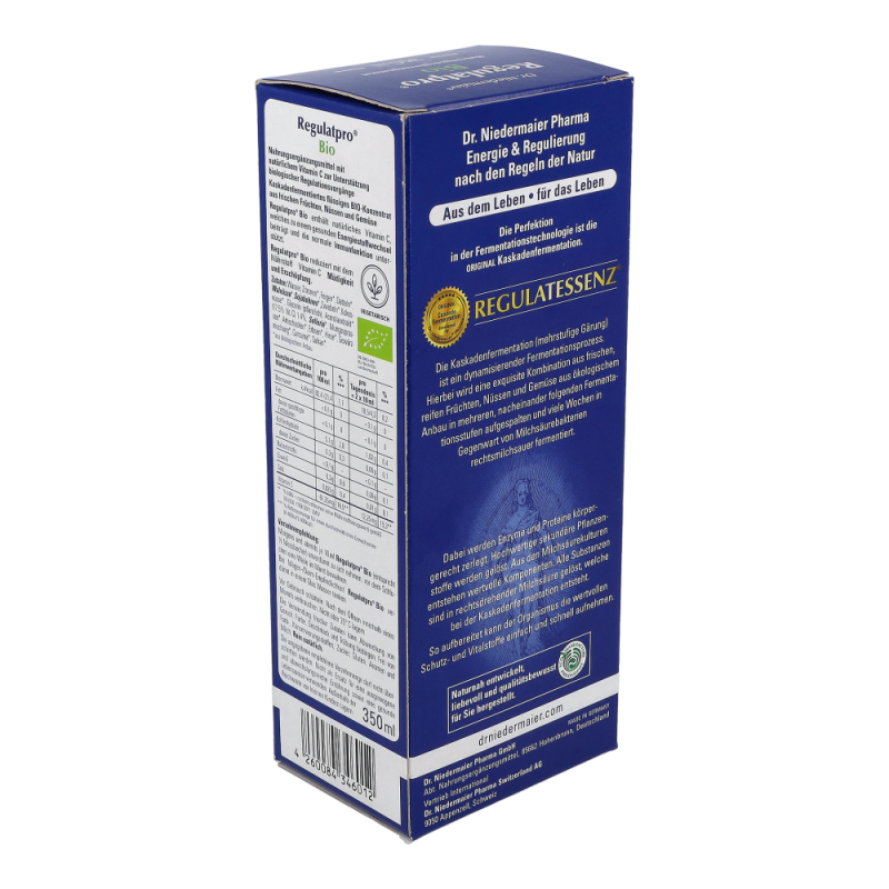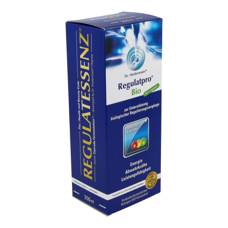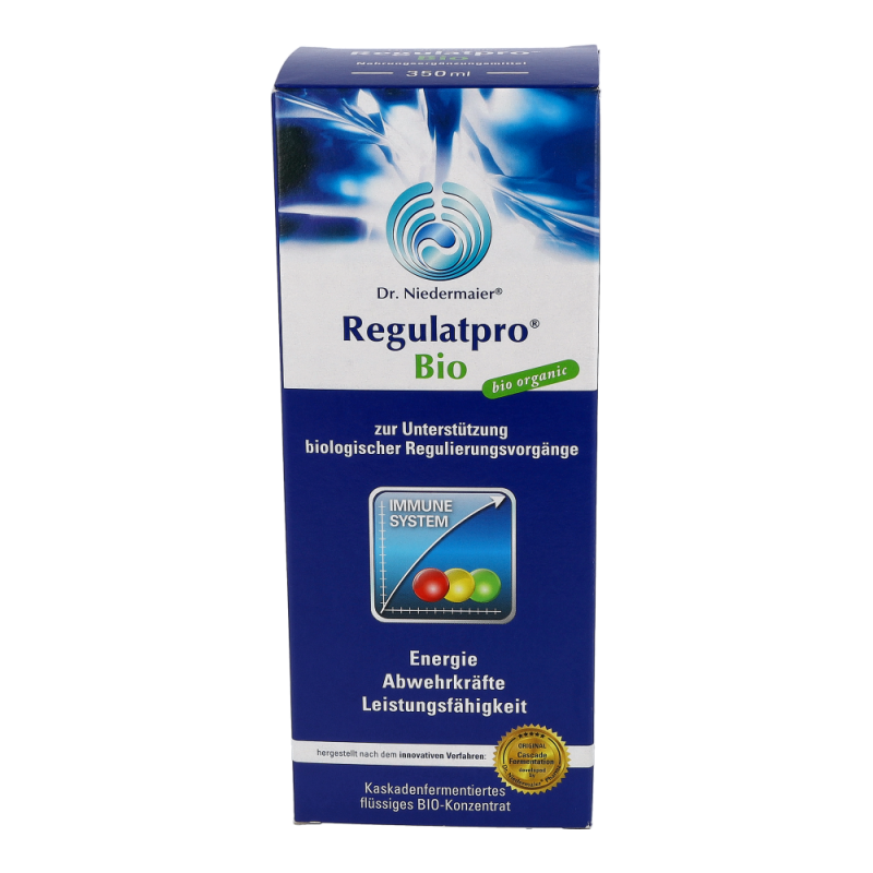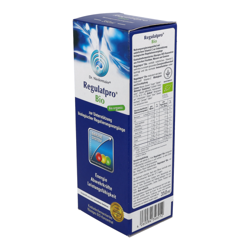 Dr. Niedermaier Regulatpro Bio 350 ml ist ein angereichertes Lebensmittel mit natürlichem Vitamin C aus der Acerolakirsche und unterstützt die biologischen Regulierungsvorgänge in unserem Körper wodurch das Immunsystem unterstützt wird. Nachweislich wird dadurch die Energie in den Zellen erhöht. Ein natürliches Plus an Energie und Leistungsfähigkeit sowie eine gestärkte Immunabwehr sind die Folge.