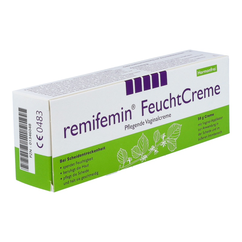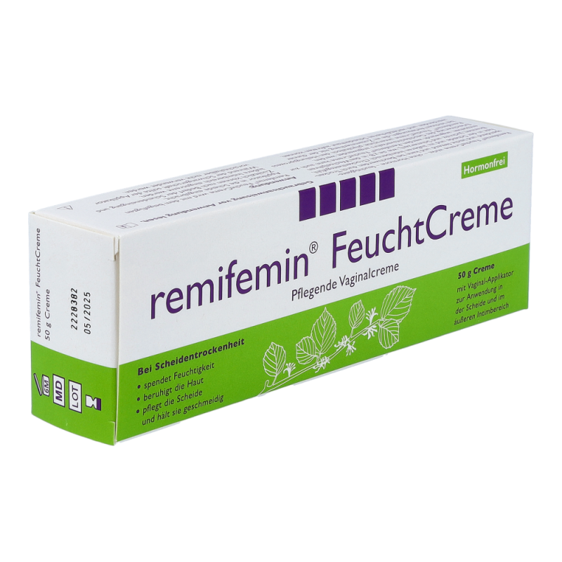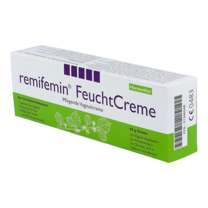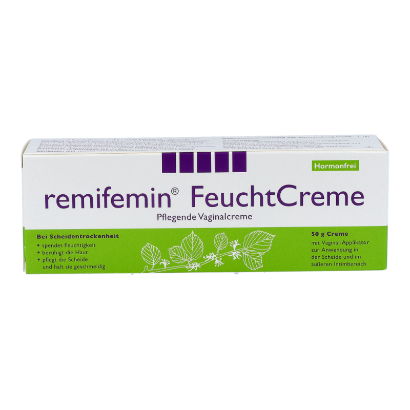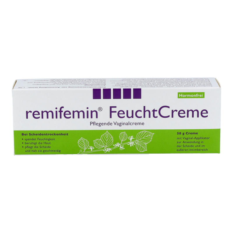 Die Remifemin vaginale Feuchtcreme dient zur Linderung von Scheidentrockenheit und das ohne den Zusatz von Hormonen, Farbstoffen oder Duftstoffen. Der hohe Wassergehalt der Creme spendet Feuchtigkeit und fettende Komponenten pflegen die Haut und halten sie geschmeidig. Da die Remifemin Feuchtcreme kein Östrogen enthält, kann sie bedenkenlos während der Schwangerschaft und Stillperiode sowie bei Hormonersatztherapien und Ähnlichem angewendet werden. Durch die Anwendung mit Remifemin Feuchtcreme wird die Scheide sowohl äußerlich als auch innerlich gepflegt und dadurch der Scheidentrockenheit entgegengewirkt. .