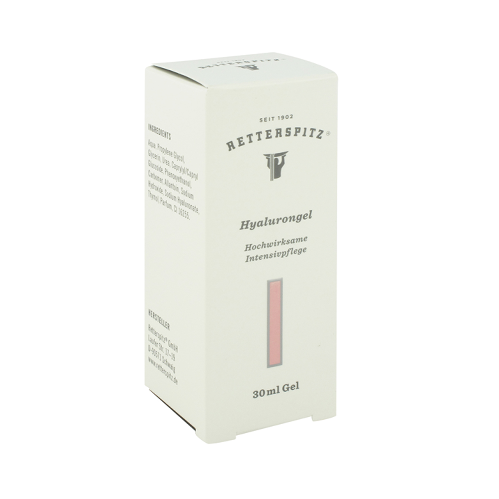 Retterspitz Hyalurongel hat die Fähigkeit Wasser zu binden. Dadurch bekommt die Haut mehr Volumen und wird auf natürliche Weise sanft aufgepolstert.Ausgesuchte Feuchthaltefaktoren wie Glycerin, Harnstoff und pflegendes Allantoin versorgen die Haut zusätzlich 24 Stunden mit Feuchtigkeit, vermindern Zeichen der Hautalterung und erhöhen die Elastizität der obersten Hautschicht. 2-3 Mal pro Woche im Gesicht, um die Augenpartie und auf dem Dékolleté auftragen. Das Gel zieht sehr schnell ein, fettet nicht und kann daher auch unter dem Make-up angewendet werden. Auch Männer können mit Retterspitz Hyalurongel Hautlinien und gestresst aussehender Haut entgegenwirken.