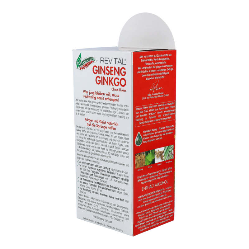 Die Ginseng-Lebenswurzel “Panax ginseng” und die gehaltreichen Ginkgo-Blätter des Urbaumes “Ginkgo biloba” bringen Körper, Geist und Seele auf natürliche Art in Einklang und sind seit altersher in China die wertvollsten Lebenskräuter. Mit Gelee Royale, dem wertvollsten Schatz der Bienen, sinnvoll ergänzt. Dieser kostbare „Königinnen-Trank“ wird in der Natur als Anti-Ageingmittel genutzt – die Bienenkönigin wird dadurch bis zu 40-mal länger leben und produktiver sein als gewöhnliche Arbeitsbienen.Natürlich flüssig – flüssige Wertstoffe in natürlicher und unverfälschter Form können dem Körper so auf direktem Weg zugeführt werden.Ohne Zusatzstoffe wie Ballaststoffe, Verdickungsmittel, Farbstoffe, Aromastoffe.Revital Ginseng Ginkgo Elixier Bio enthält die gesamten Pflanzen und Früchte in ihrem natürlichen Gefüge, denn sie enthalten vielfältigere bioaktive Wertstoffe..