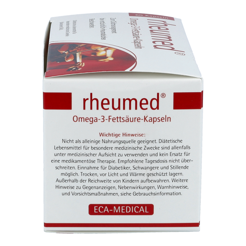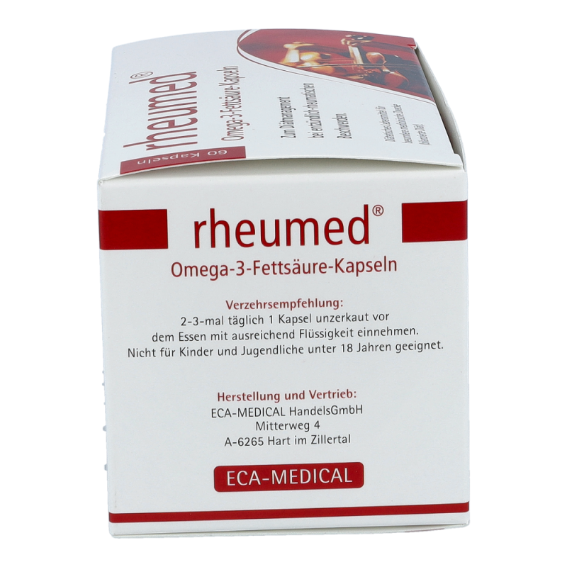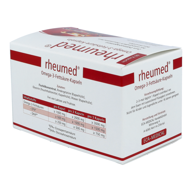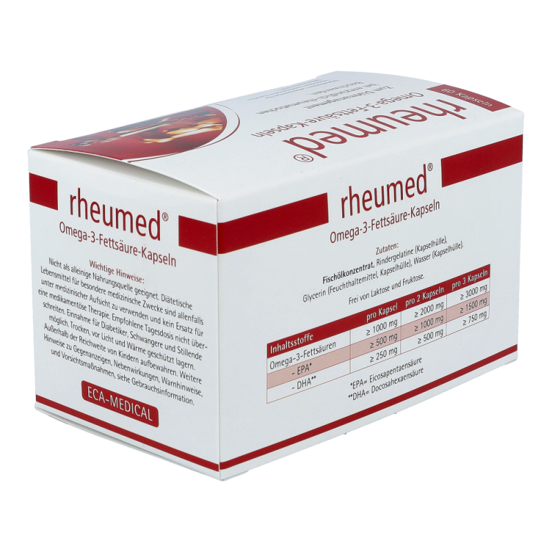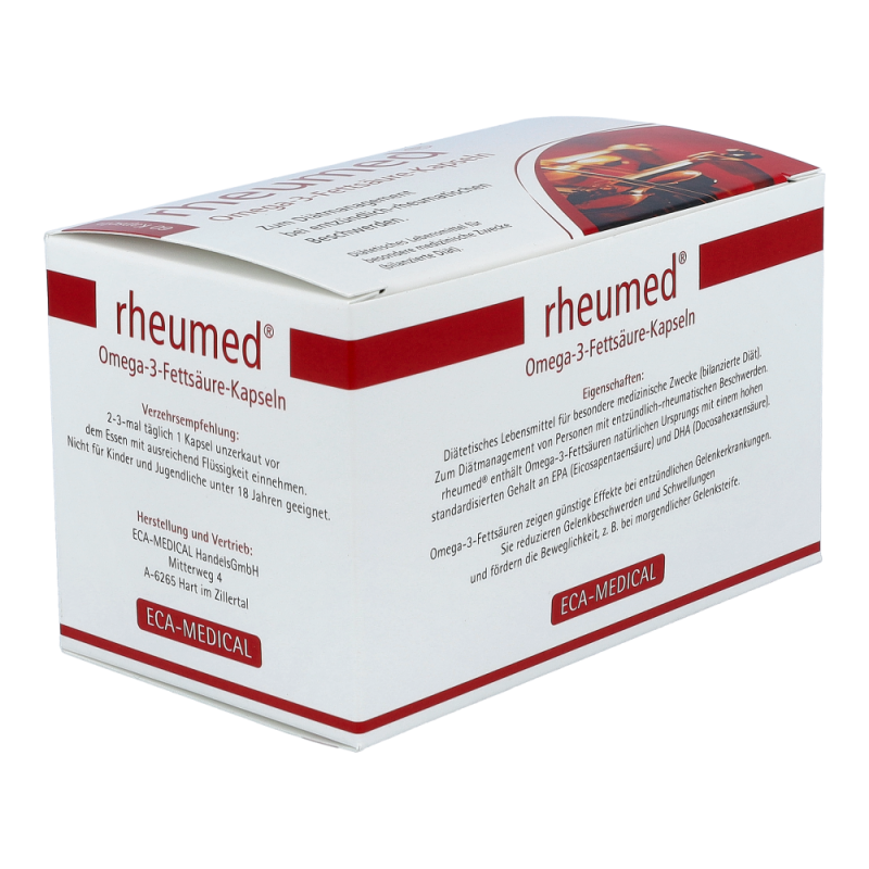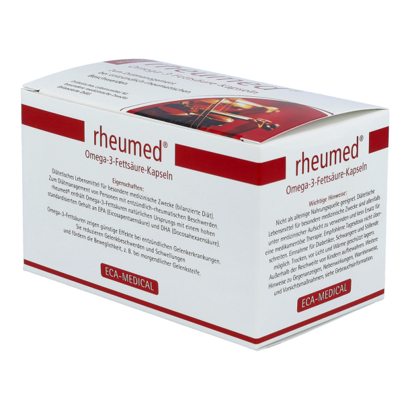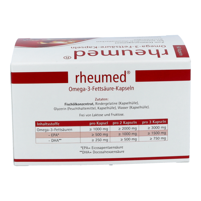 Rheumed Kapseln dienen zur diätischen Behandlung von entzündlichen und schmerzhaften Beschwerden bei rheumatischen Erkrankungen. Hochdosierte Omega-3 Fettsäuren vermindern die Schmerzen und fördern die Beweglichkeit. Entzündungen werden gelindert und Schwellungen gehen zurück.