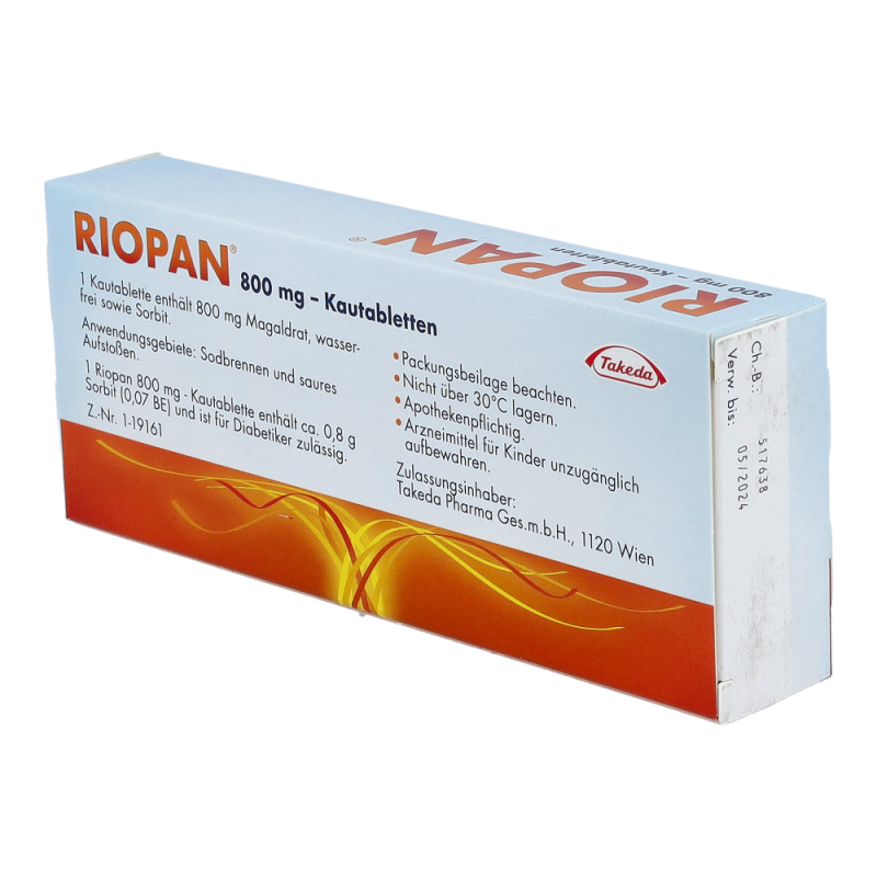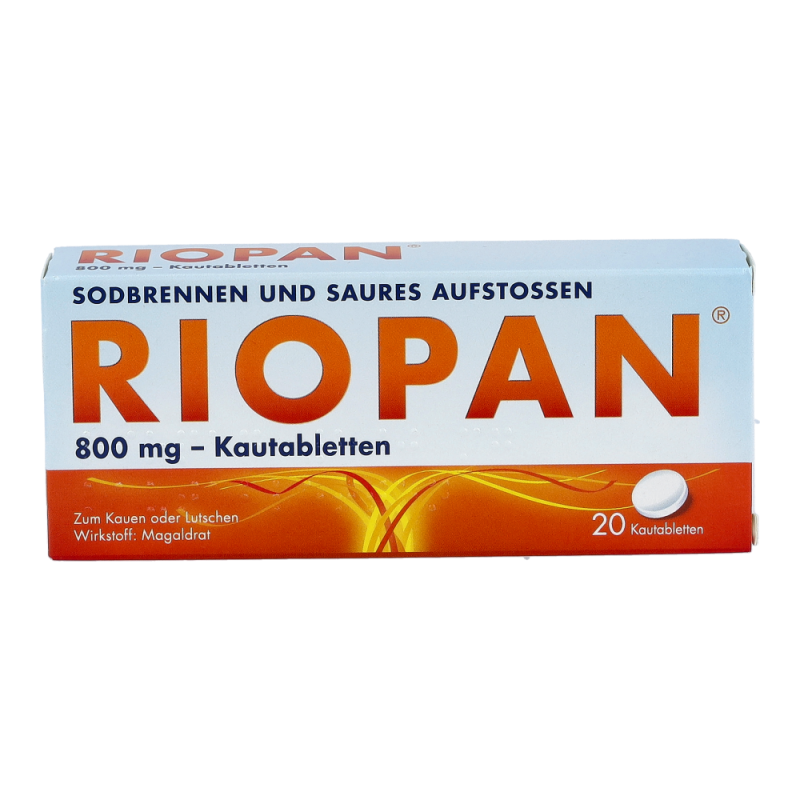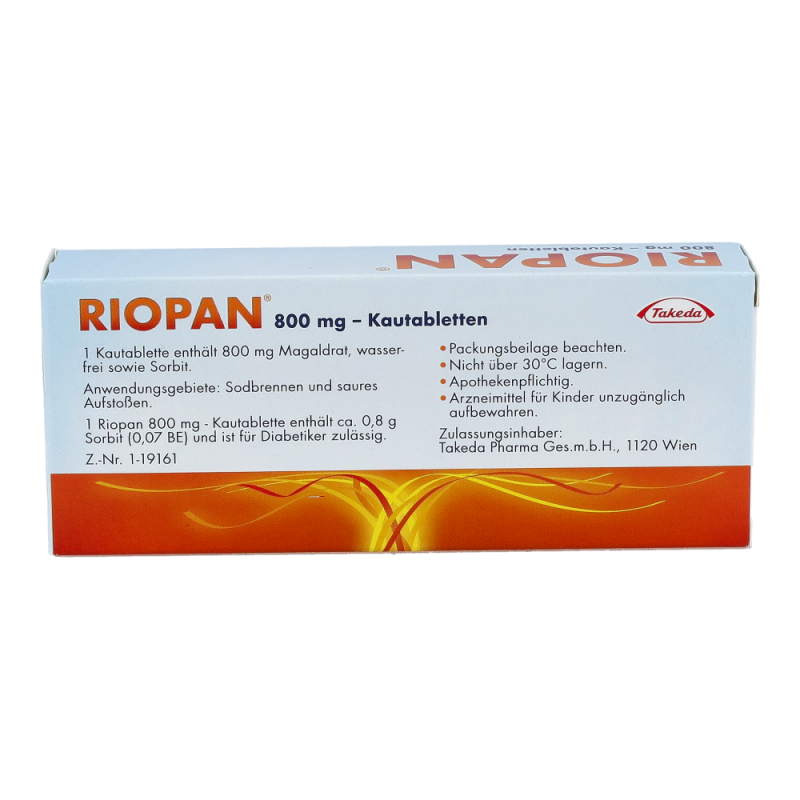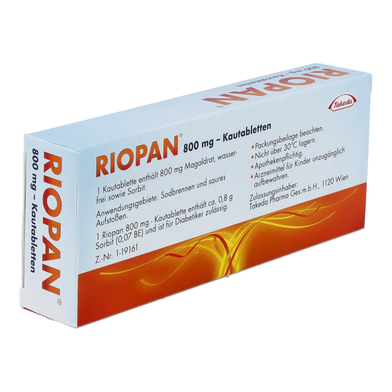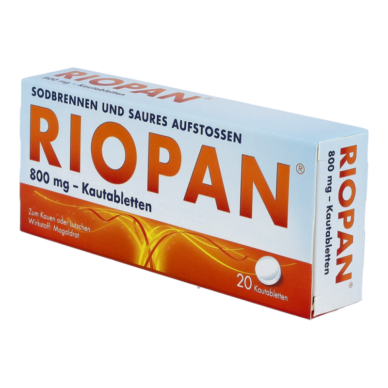 Riopan 800 mg Kautabletten enthält den Wirkstoff Magaldrat und bindet überschüssige Magensäure. Die Wirkung von Riopan hält meist mehrere Stunden an.
