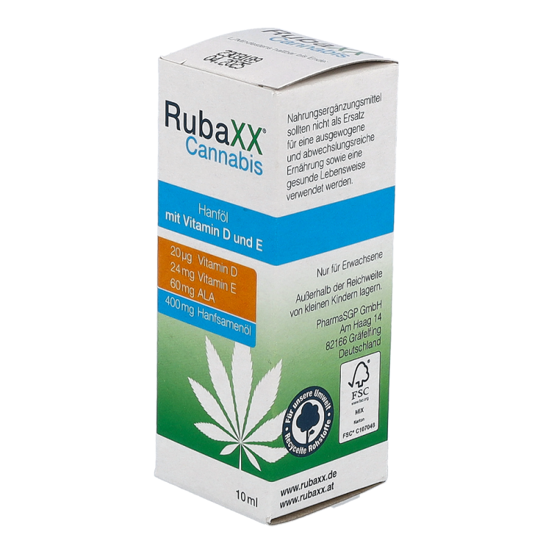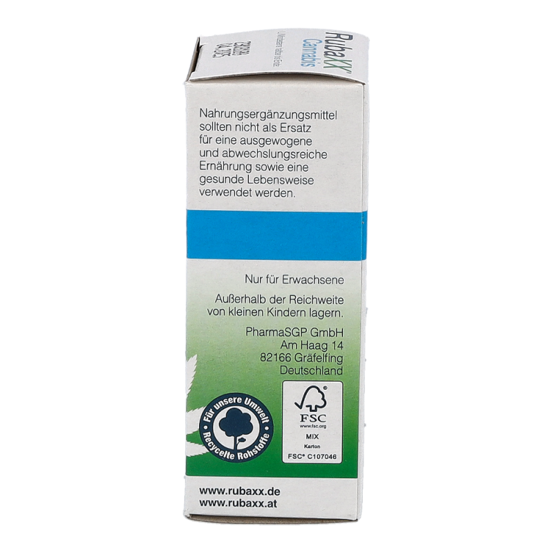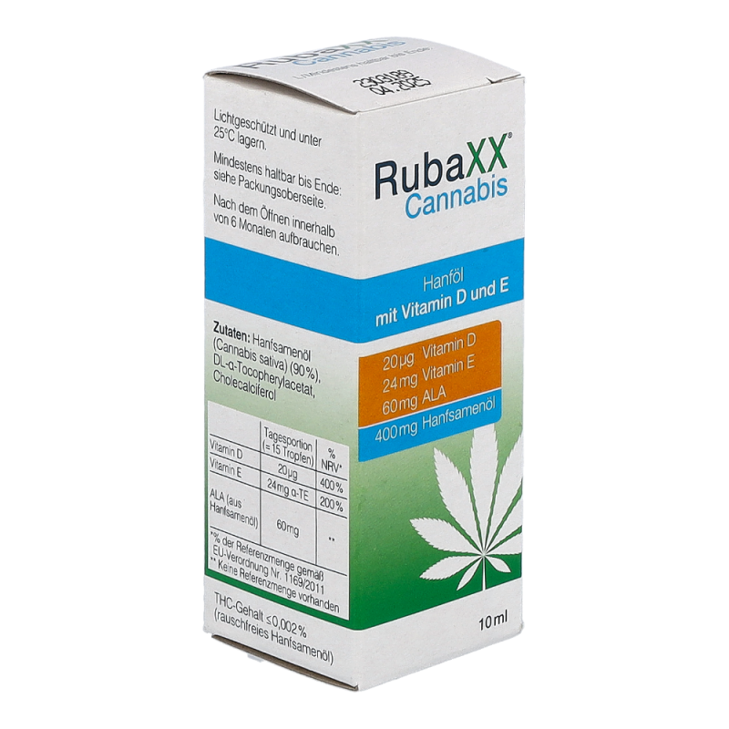 RubaXX Cannabis ist ein Nahrungsergänzungsmittel. Für RubaXX Cannabis wird ein hochwertiges Cannabissamenöl verwendet. Das Geniale: Cannabissamen haben keine berauschende Wirkung.Die Produktion findet unter strengsten deutschen Qualitätsstandards statt. RubaXX Cannabis ist vegan, sowie frei von Gluten, Lactose, Fructose, Gelatine und sämtlichen Zusatzstoffen. Empfohlen wird ein Verzehr von bis zu 3&thinsp x&thinsp 5 Tropfen täglich. RubaXX Cannabis wurde speziell für den täglichen Verzehr entwickelt.Die angegebene empfohlene tägliche Verzehrsmenge darf nicht überschritten werden. Neben- und Wechselwirkungen sind beim Verzehr von RubaXX Cannabis nicht bekannt. Nahrungsergänzungsmittel sollten nicht als Ersatz für eine ausgewogene und abwechslungsreiche Ernährung sowie eine gesunde Lebensweise verwendet werden. Das Produkt ist außerhalb der Reichweite von kleinen Kindern aufzubewahren.