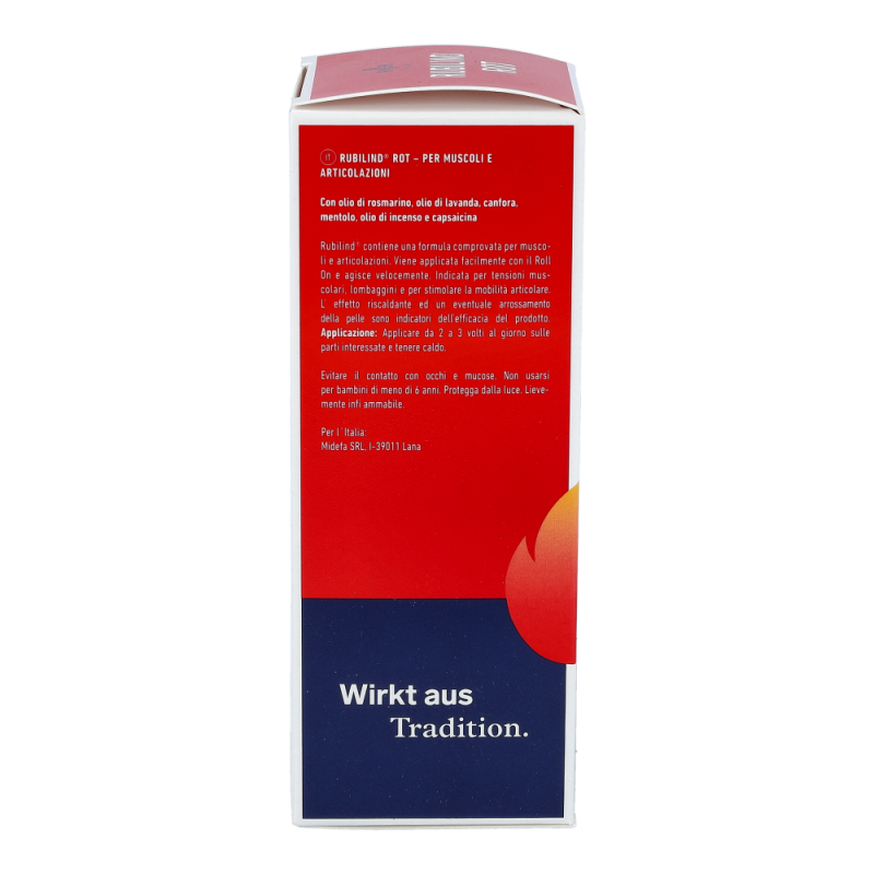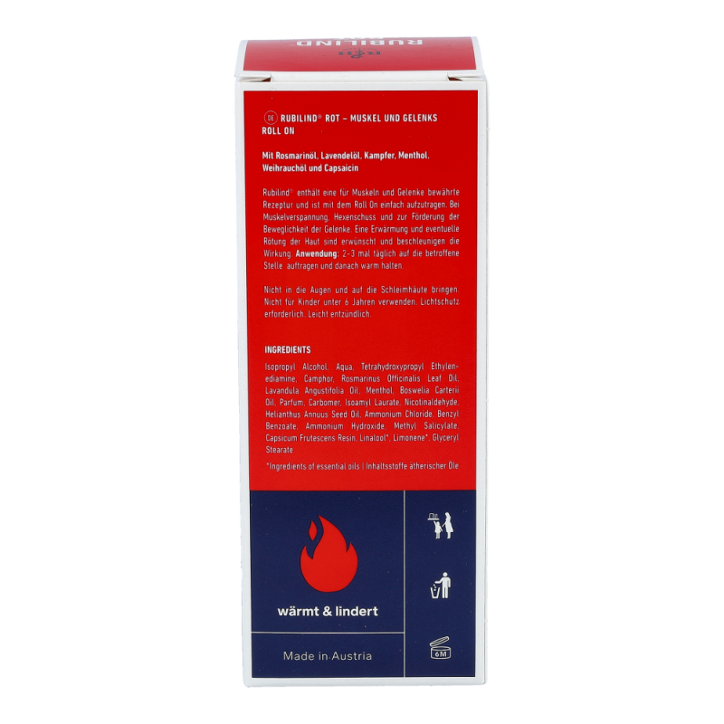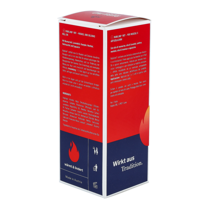 Rubilind enthält sowohl Lavendelöl, welches bereits seit der Antike als vielseitige Heilpflanze verwendet wird, als auch das wertvolle Rosmarinöl und Kampfer, welche für die durchblutungsfördernde und lockernde Wirkung auf den gesamten Bewegungsapparat geschätzt werden. Kampfer wird mittels Wasserdampfdestillation aus sämtlichen Teilen des Kampferbaums gewonnen. Die wärmende Wirkung erhält Rubilind Rot durch Nicotinaldehyd und das enthaltene Capsaicin, welches aus der Chilischote gewonnen wird.