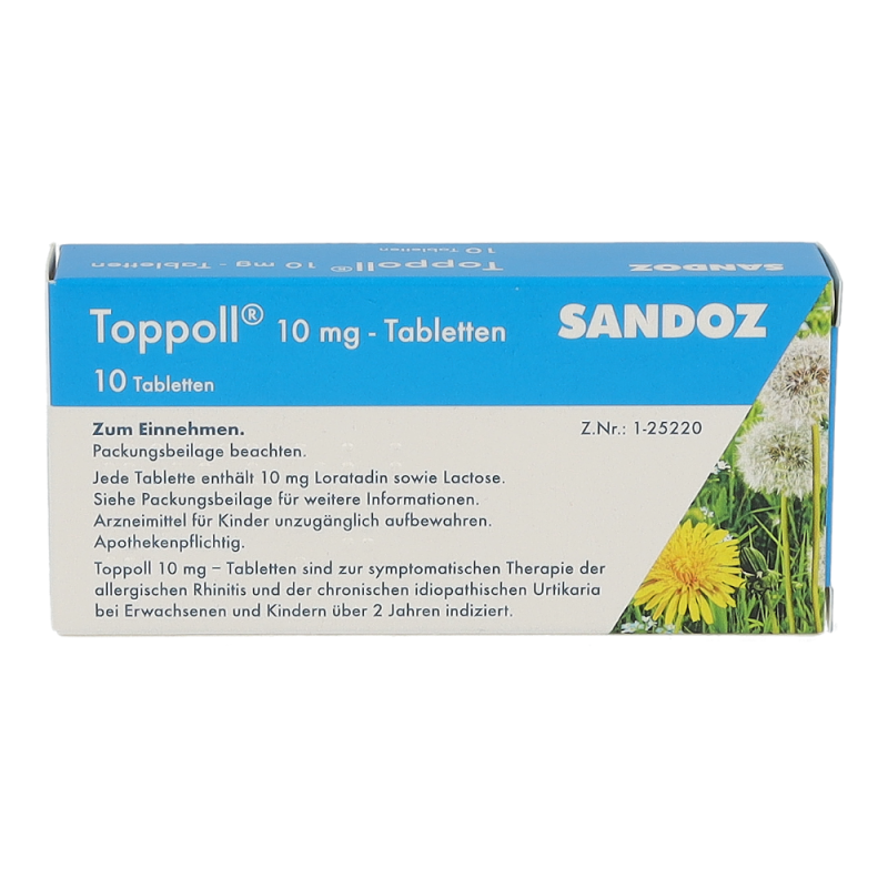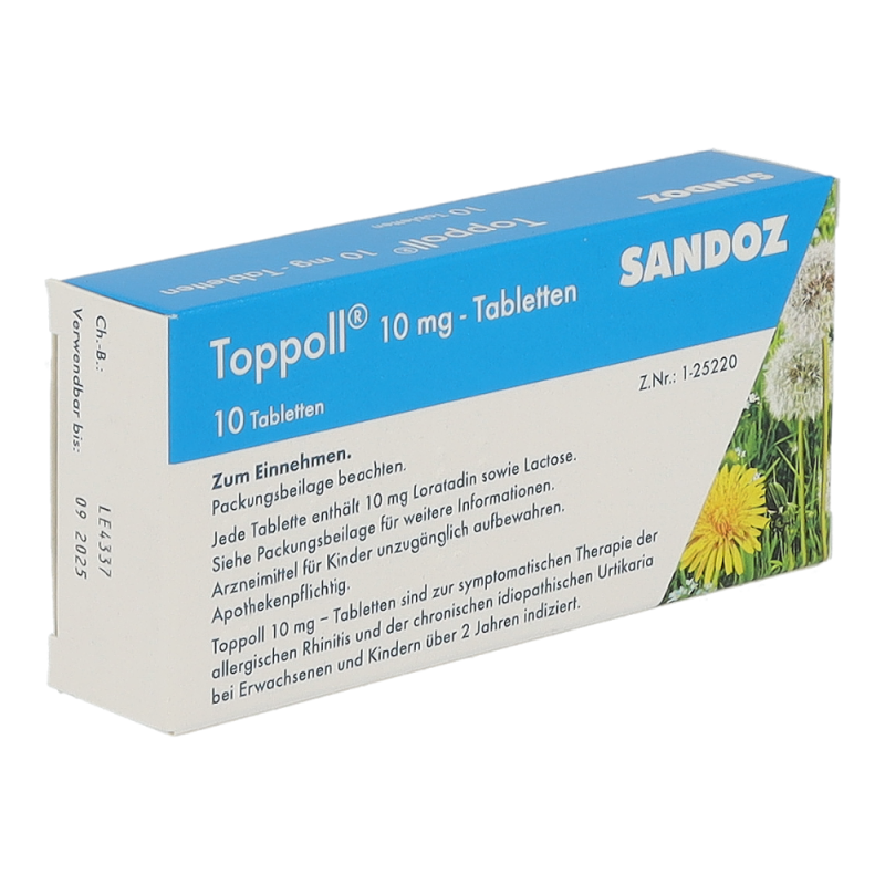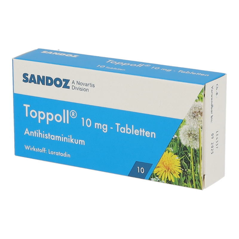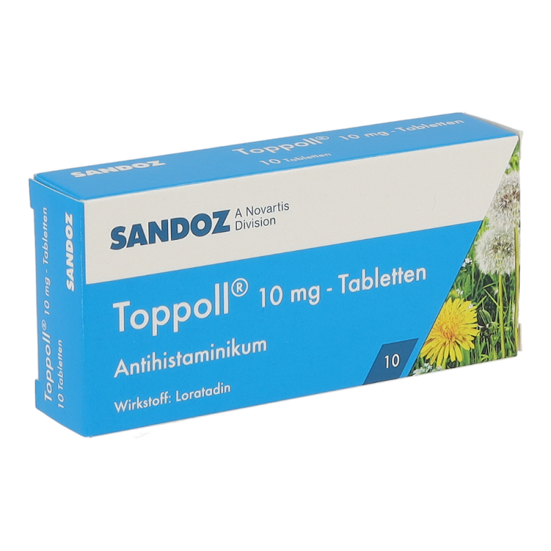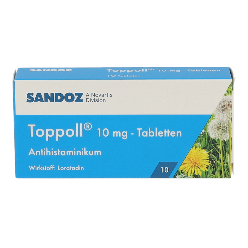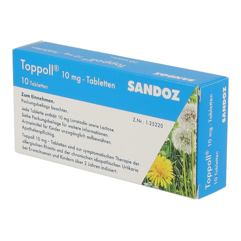 Toppoll 10 mg Tabletten gehören zur Gruppe der Antihistaminika und sind geeignet zur Behandlung von allergisch bedingten Entzündungen in der Nase. Dazu zählen etwa Heuschnupfen und chronische Nesselsucht unbekannter Ursache.