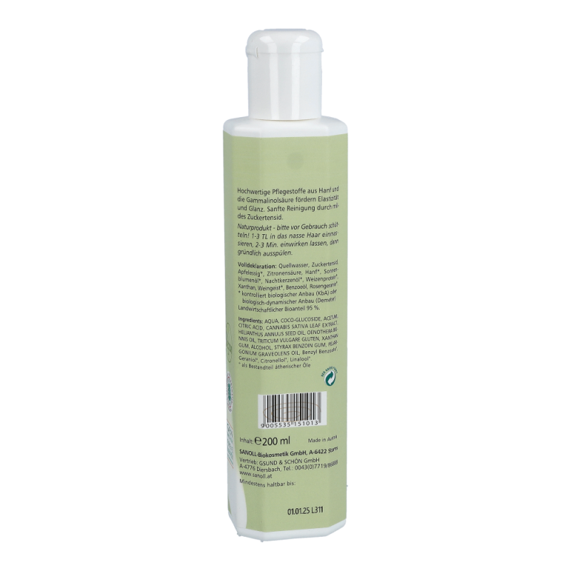 Sanoll Hanf Shampoo für normales, gesundes Haar. Hochwertige Pflegestoffe aus Hanf und Gammalinolsäure fördern Elastizität und Glanz. Sanfte Reinigung durch Zuckertensid.