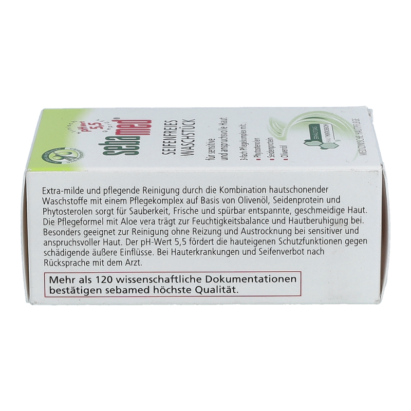 Mit einem Pflegekomplex auf Basis von Olivenöl, Seidenprotein und Phytosterolen sorgt das sebamed Seifenfreie Waschstück Olive für Sauberkeit, Frische und spürbar entspannte, geschmeidige Haut. Die Pflegeformel mit Aloe vera trägt zur Feuchtigkeitsbalance und Hautberuhigung bei. Besonders geeignet zur Reinigung ohne Reizung und Austrocknung bei sensitiver und anspruchsvoller Haut. Der pH-Wert 5,5 fördert die hauteigenen Schutzfunktionen gegen schädigende äußere Einflüsse..