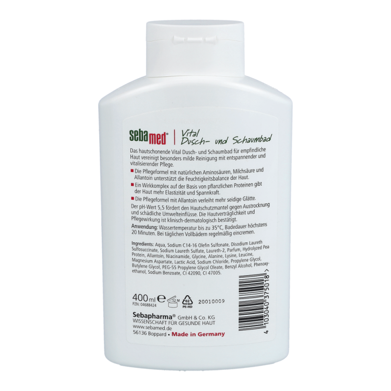 Das hautschonende Vital Dusch + Schaumbad für empfindliche Haut vereinigt besonders milde Reinigung mit entspannender und vitalisierender Pflege. Der pH-Wert 5,5 fördert den Hautschutzmantel gegen Austrocknung und schädliche Umwelteinflüsse. Die Hautverträglichkeit und Pflegewirkung ist klinisch-dermatologisch bestätigt.
