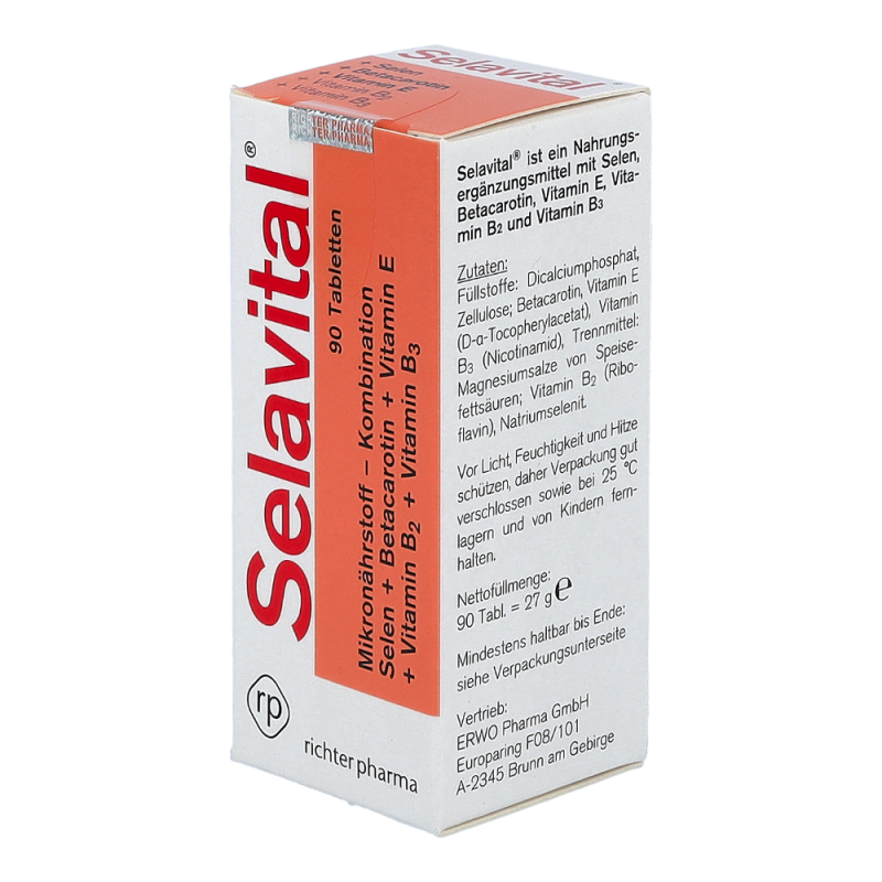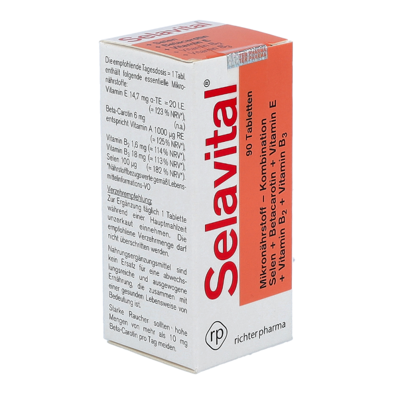 Selavital® ist ein Nahrungsergänzungsmittel mit Selen, Betacarotin, Vitamin E, Vitamin B2 und Vitamin B3. Selen trägt zur normalen Funktion des Immunsystems und der Schilddrüse bei. Vitamin E und Vitamin B2 schützen die Zellen vor oxidativem Stress und Vitamin B3 trägt zu einem normalen Energiestoffwechsel bei.