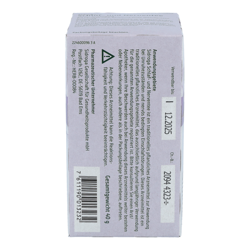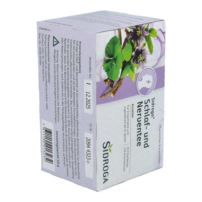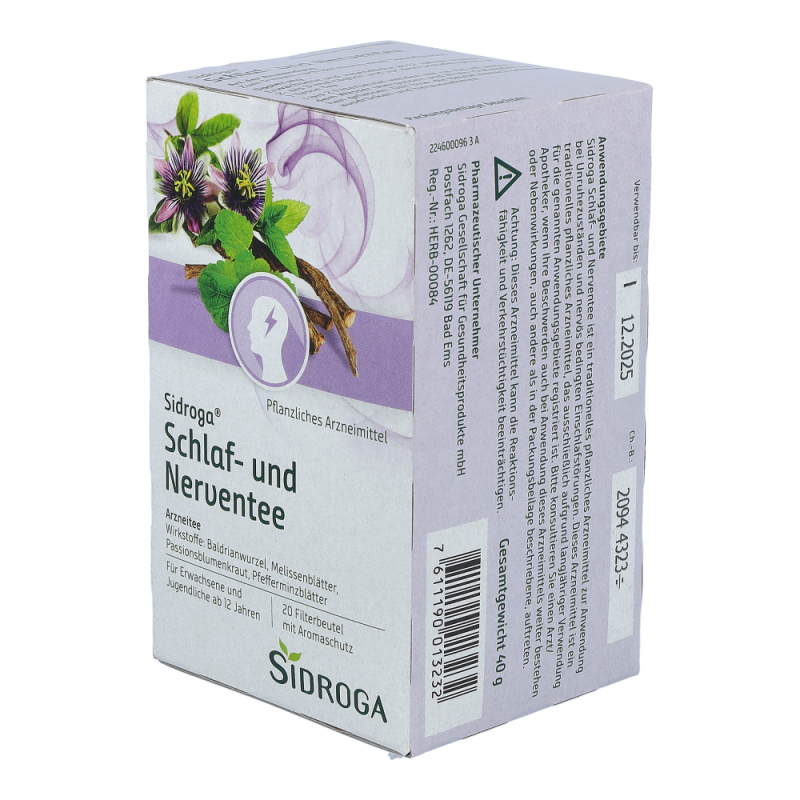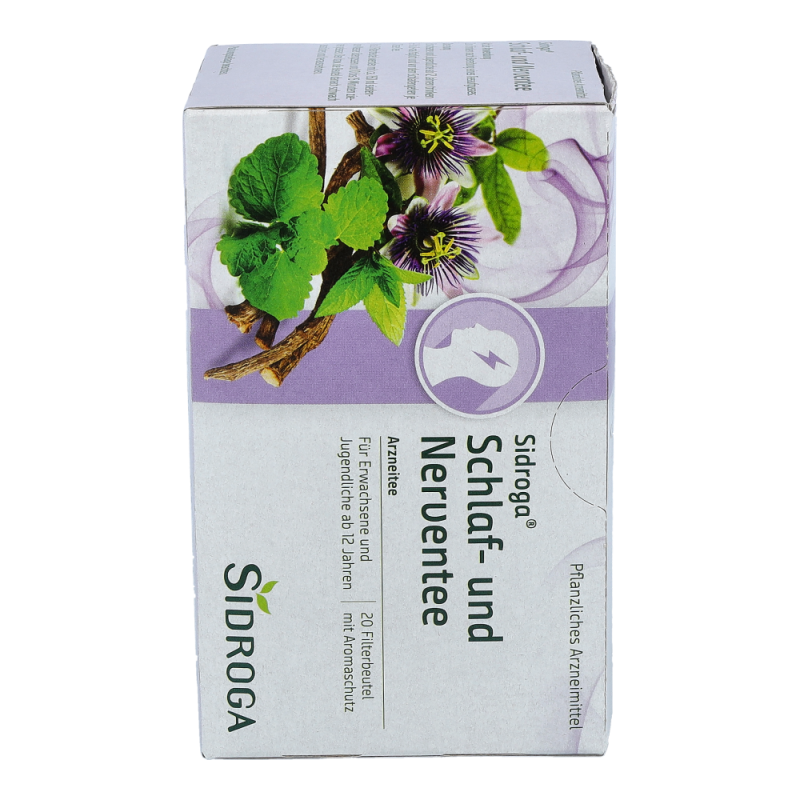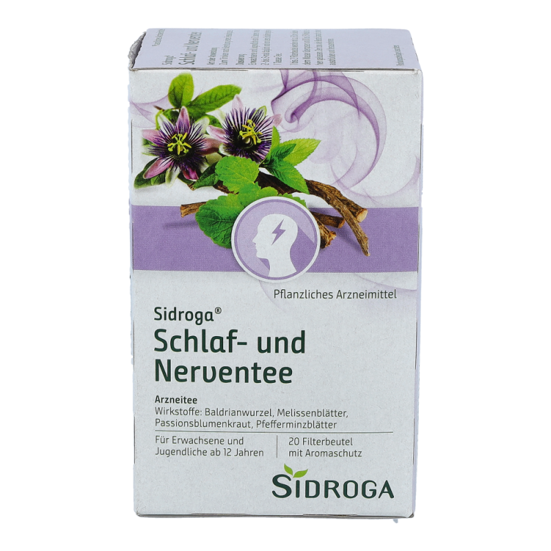 Sidroga Schlaf- und Nerventee ist eine hochwertige Mischung ausgesuchter Pflanzen mit schlaffördernden Eigenschaften: Baldrianwurzel, Melissenblätter und Passionsblumenkraut sind für ihre beruhigenden und schlaffördernden Eigenschaften bekannt. Pfefferminzblätter tragen zur Wirkung des Tees bei. Rosmarinblätter sowie Anis und Süßholzwurzel runden diesen Tee mit ihren nuancierten Aromen geschmacklich ab.