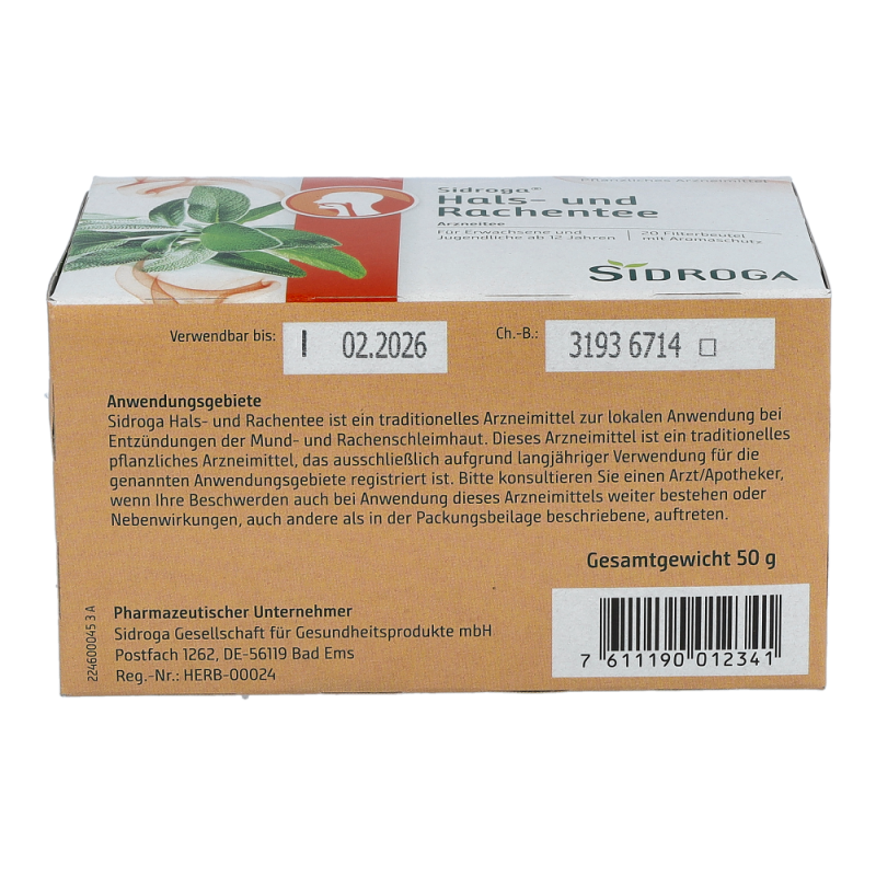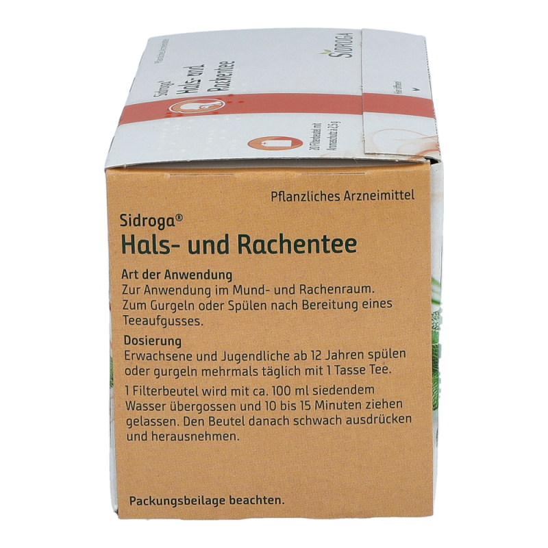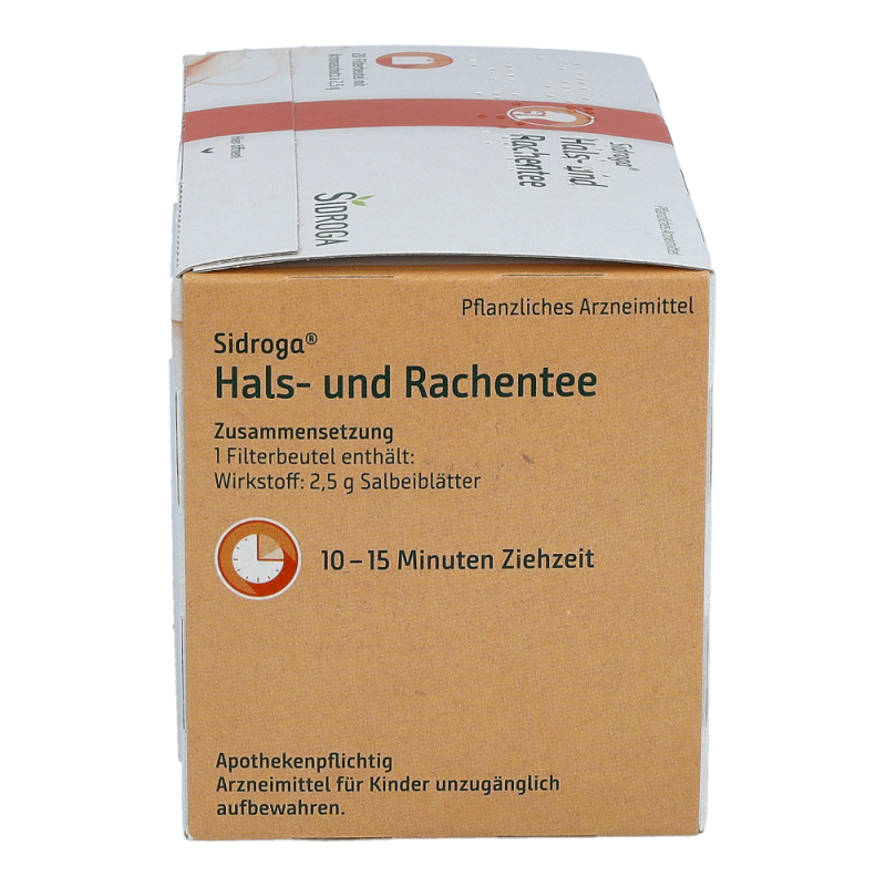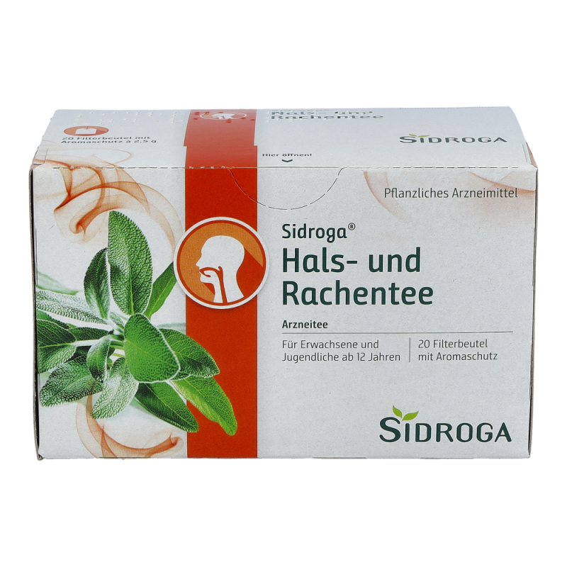Sidroga Hals- und Rachentee ist ein traditionelles pflanzliches Arzneimittel zur Anwendung bei Entzündungen der Mund- und Rachenschleimhaut. Der Tee enthält geschnittenen Salbei zur Linderung von Halsschmerzen und zur Beruhigung der Schleimhaut im Mund und Rachenbereich. .
