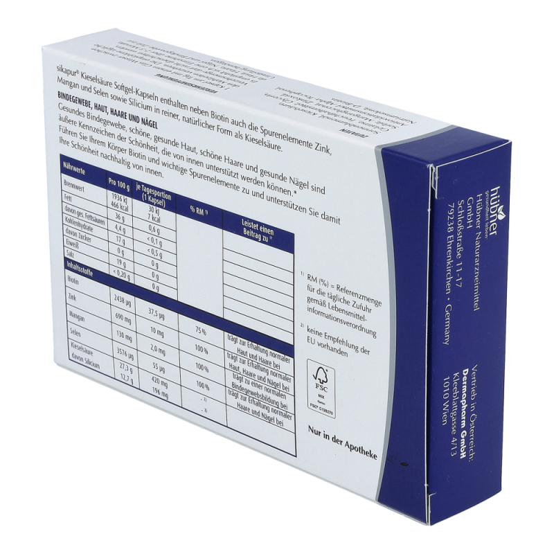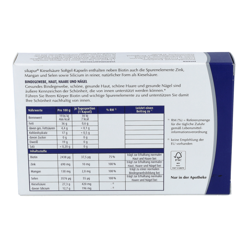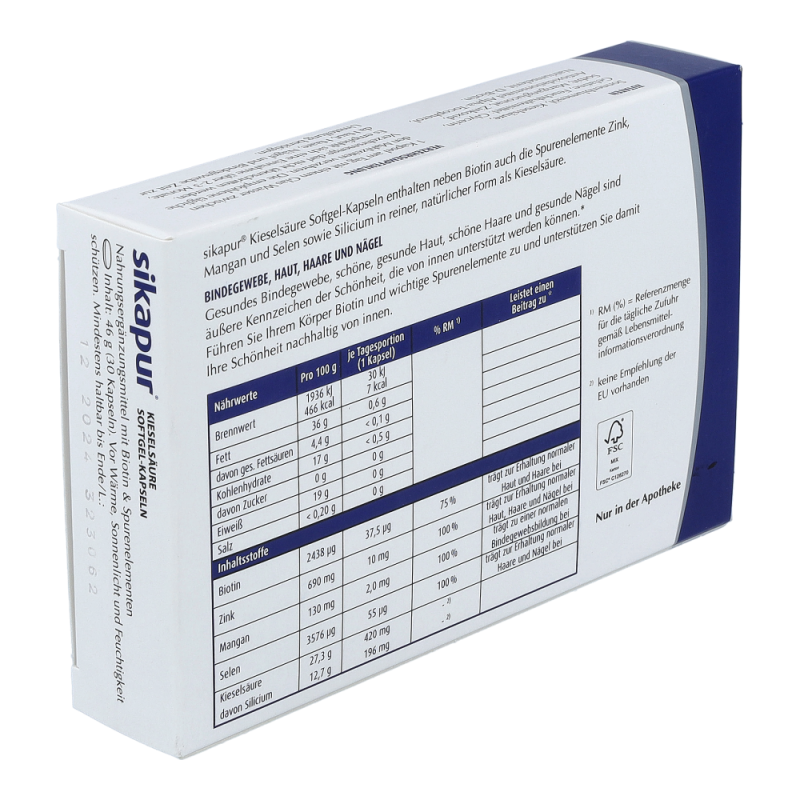 sikapur® Softgel Kapseln enthalten Zink, Mangan, Selen und Biotin sowie zusätzlich das Spurenelement Silicium in reiner, natürlicher Form als Kieselsäure Silicium. Führen Sie ihrem Körper wichtige Spurenelemente in Form dieser Kapseln zu und unterstützen Sie damit Ihre Schönheit nachhaltig von innen.