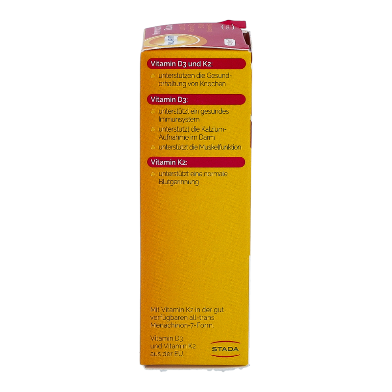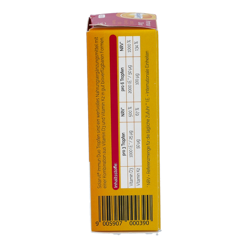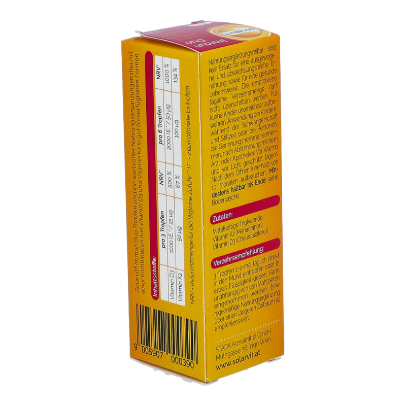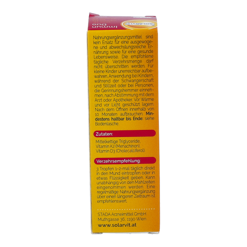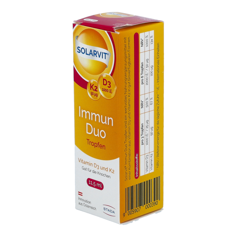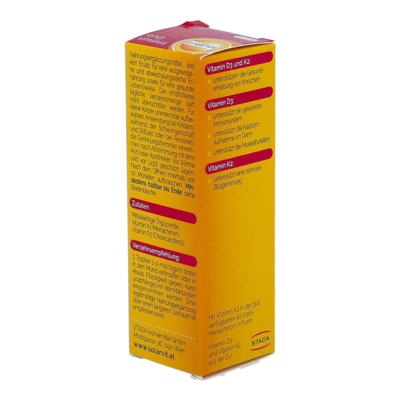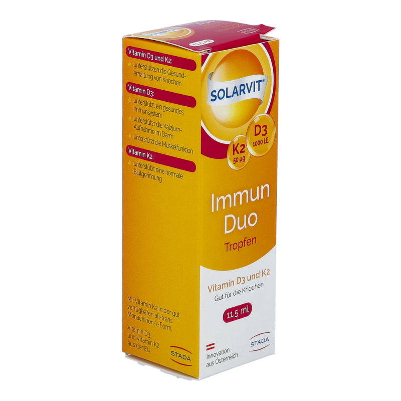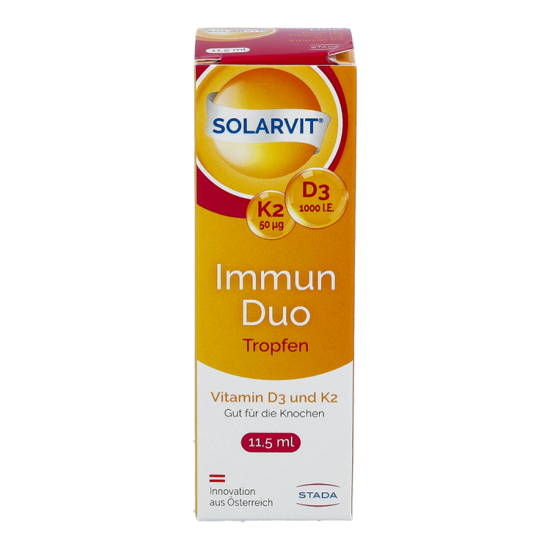 Solarvit DuoProtect D3 K2 Tropfen ist ein Nahrungsergänzungsmittel für gesunde Knochen und zur Regulierung des Kalziumspiegels. Die Tropfen liefern dem Körper Kalzium, Vitamin D und Vitamin K2 in einer besonders gut bioverfügbaren Form, um die Knochengesundheit zu unterstützen. Durch die Darreichung in Form von Tropfen ist die Dosierung mittels Pipette besonders einfach und auch für Personen mit Schluckbeschwerden geeignet.