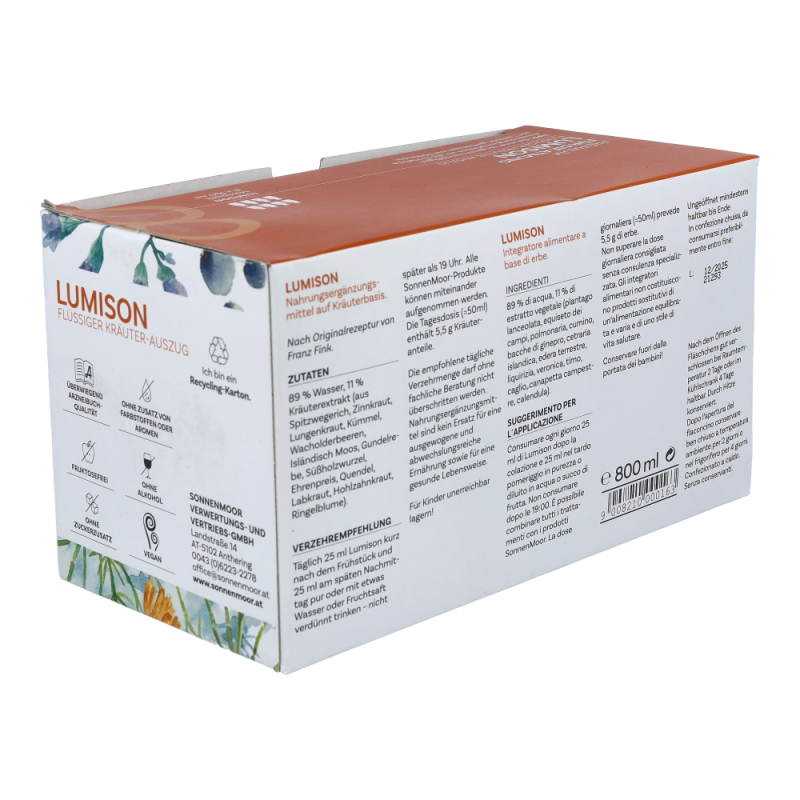 89 % Wasser, 11 % Kräuterextrakt aus: Spitzwegerich, Zinnkraut, Lungenkraut, Kümmel, Wacholderbeeren, Isländisch Moos, Gundelrebe, Süßholzwurzel, Ehrenpreis, Quendel, Labkraut, Hohlzahnkraut, Ringelblume