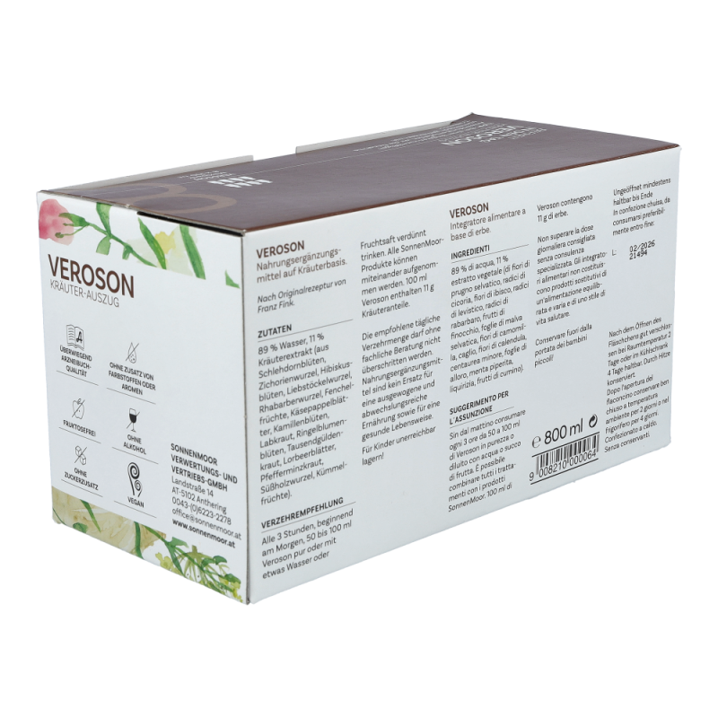 89 % Wasser, 11 % Kräuterextrakt aus: Schlehdornblüten, Zichorienwurzel, Hibiskusblüten, Liebstöckelwurzel, Rhabarberwurzel, Fenchelfrüchte, Käsepappelblätter, Kamillenblüten, Labkraut, Ringelblumenblüten, Tausendgüldenkraut, Lorbeerblätter, Pfefferminzkraut, Süßholzwurzel, Kümmelfrüchte.