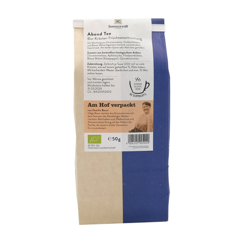 "Verbreitet stimmungsvolle Gemütlichkeit" Um dem Trubel des Alltags zu entfliehen ist es manchmal hilfreich, den Abend bewusst ruhig zu verbringen. Der SONNENTOR Abendtee ist eine harmonische Kräutermischung, speziell für genussvolle Abende. Neben Zitronenmelisse enthält die bekömmliche Teemischung auch Himbeerblätter und Käsepappel. Der Tee wird am besten ca. eine Stunde vor dem Schlafen gehen getrunken.