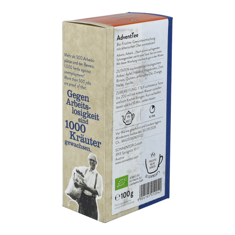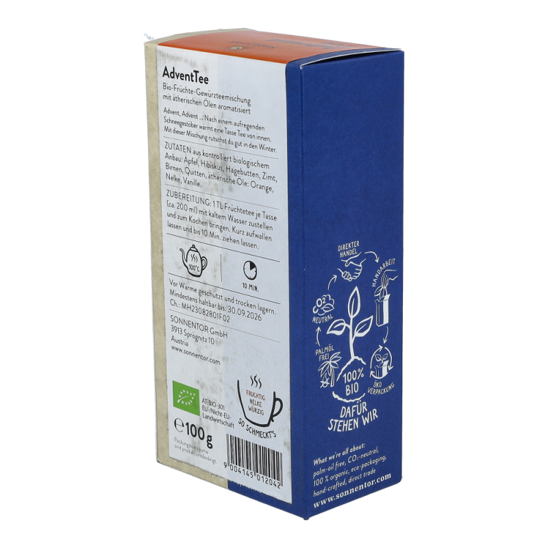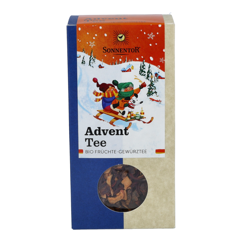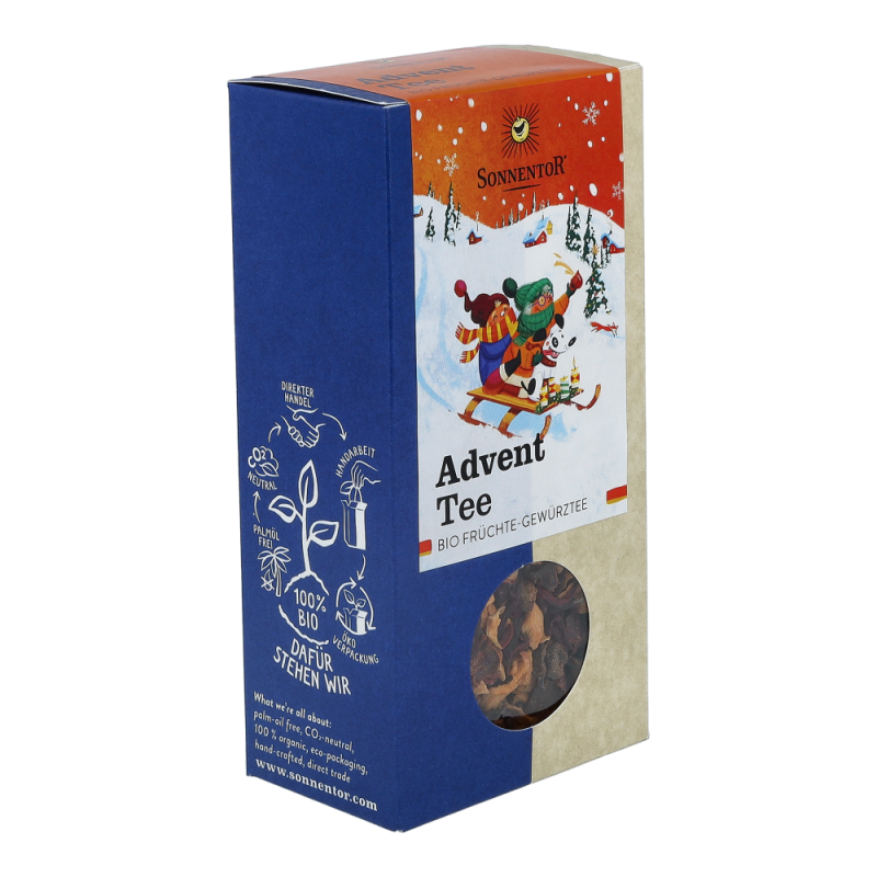Der Sonnentor Advent Tee in der losen Variante (100 g) lässt weihnachtliche Stimmung in Ihrer Teetasse aufkommen! Nelken und Zimt geben dem Tee eine besinnliche Komponente, den fruchtigen Konterpart bilden Apfelstücke, Birne, Quittenfrüchte und Hagebutten – jetzt mit dem Sonnentor Advent Tee durch die kalte Jahreszeit!