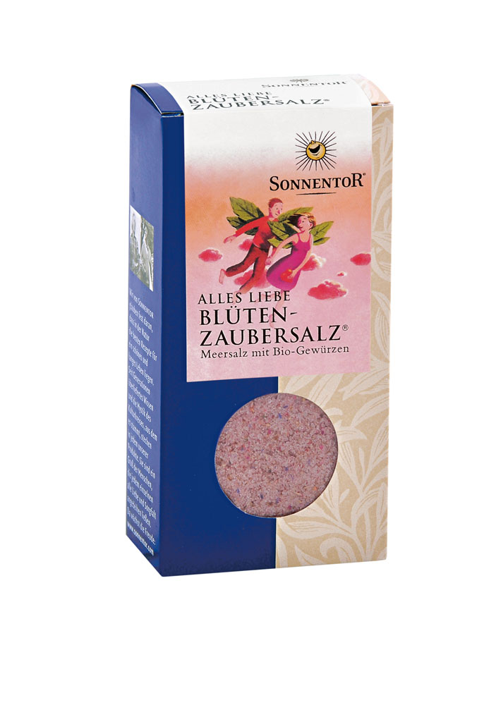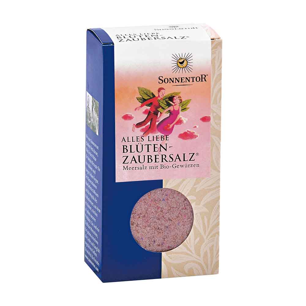 Das Alles Liebe Blütenzaubersalz verführt das Auge, wo sich auf einem weißen Salzbeet blaue, rosa und gelbe Blüten tummeln. Die süß-säuerliche Komposition verfeinert Frischkäse, helles Fischfleisch, Pasta und vieles mehr. Zaubert auch ein herrliches Frühstücksei!