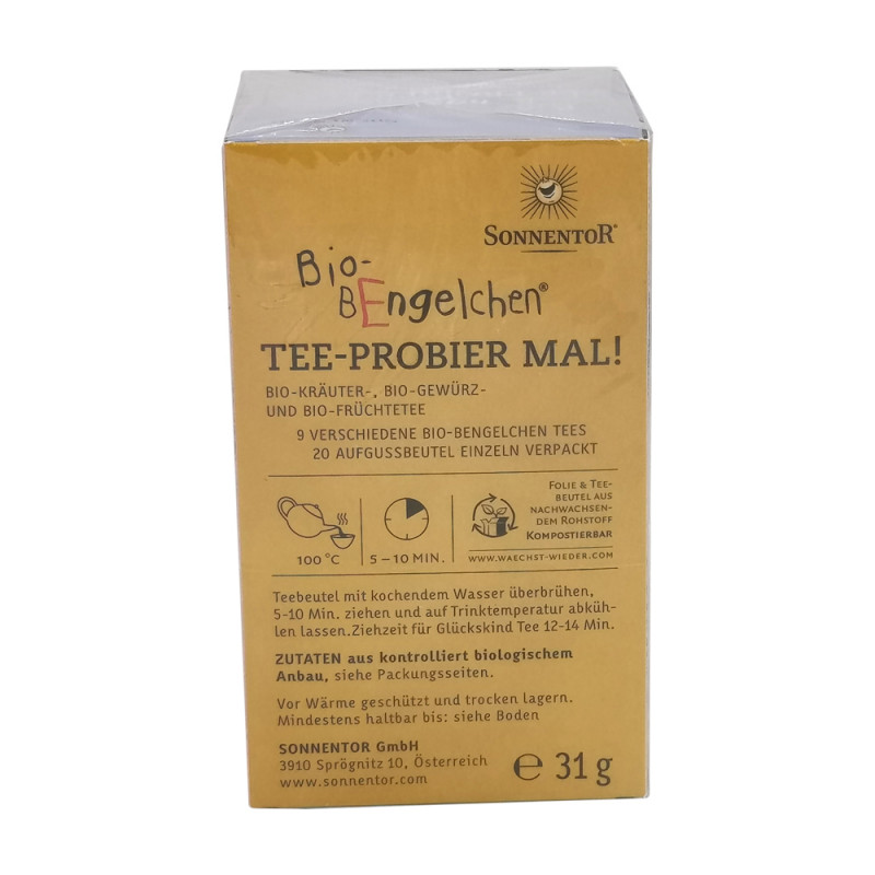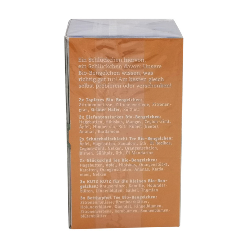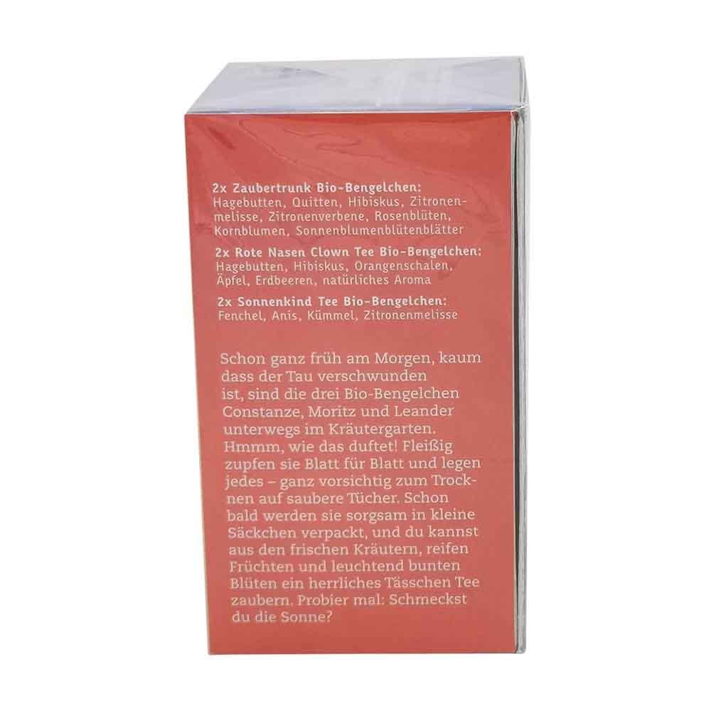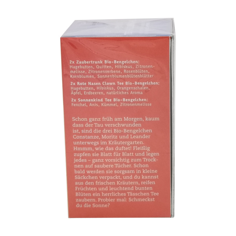 Ein Schlückchen hiervon, ein Schlückchen davon: Unsere Bio-Bengelchen wissen, was richtig gut tut! Das Probier-Set mit insgesamt 20 Beuteln und 9 verschiedenen Bio-Bengelchen Teesorten. Am besten gleich selbst probieren oder auch toll als Geschenktipp! Der beigelegte Bogen mit den Bio-Bengelchen-Figuren verleitet nicht nur kleine Bastler zum Spielen. Auf dem Bastelbogen sind die 3 Bio-Bengelchen abgebildet, welche man ausschneiden kann. Die farbenfrohe Teebox mit den aufklappbaren Flügeln lässt in jedem Kinderzimmer eine bunte Naturwelt erstrahlen und dient auch als gemütliches Zuhause für die drei Bio-Bengelchen. Viel Spaß!