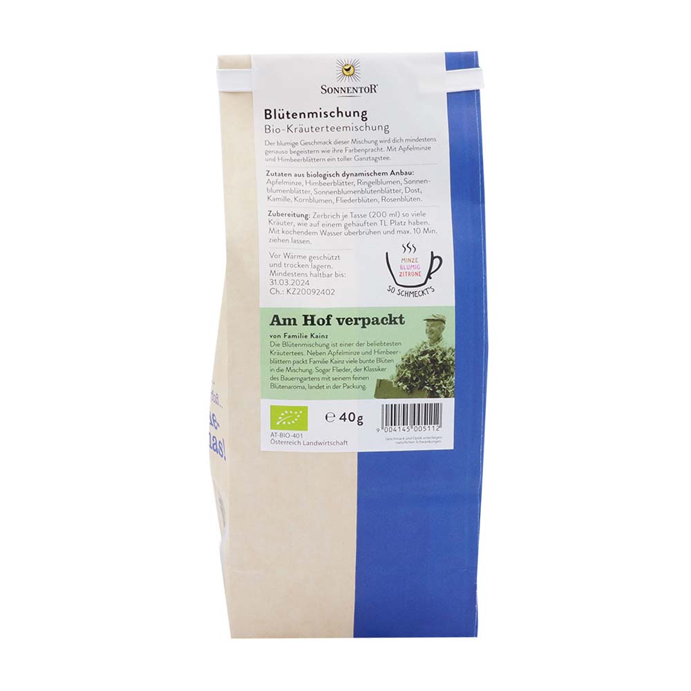 Apfelminze bio, Himbeerblätter bio, Ringelblumen bio, Sonnenblumenblätter bio, Sonnenblumenblütenblätter bio, Dost bio, Kamille bio, Kornblumen bio, Fliederblüten bio, Rosenblüten bio